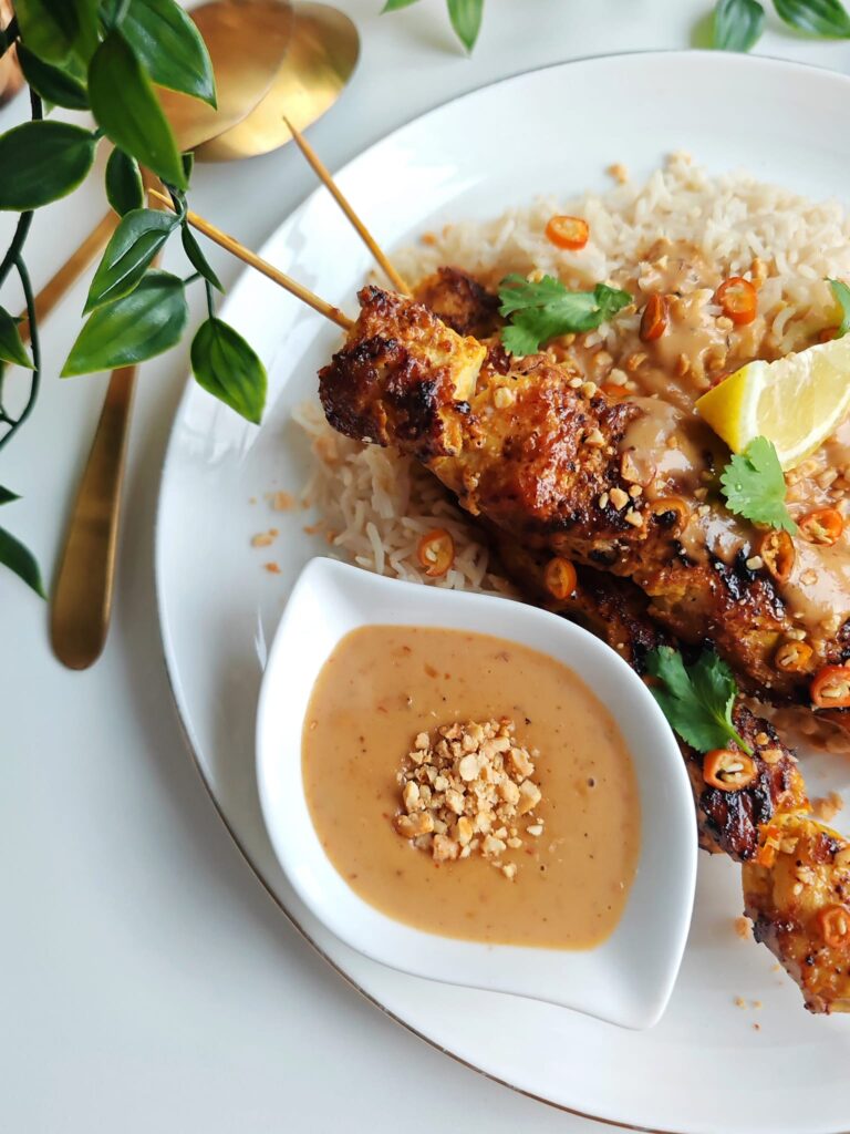 Une recette de la street et finger food par excellence : de tendre morceaux de poulet doucement marinés puis grillés avant d’être servis avec une sauce à base de beurre de cacahuète et lait de coco bien parfumée !