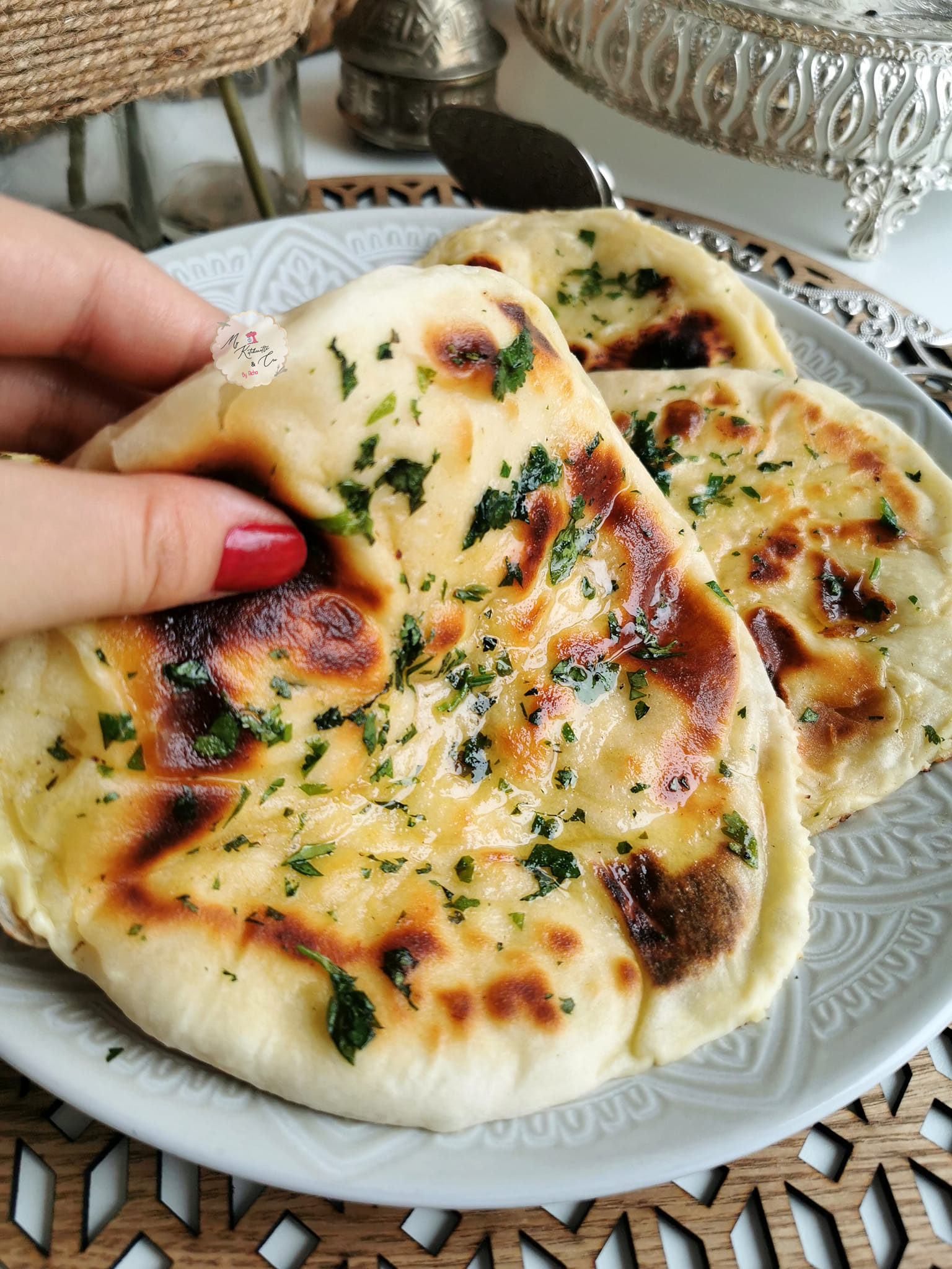6.Une fois le naan cuit, réservez-le sur une assiette et badigeonnez d’un mélange beurre fondu/persil