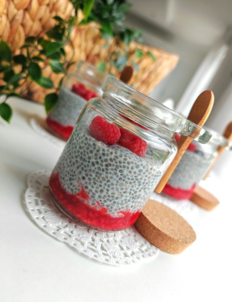 6. Montage : ajoutez dans le fond des verrines un peu de coulis/écrasé de framboises, du pudding chia et ajoutez quelques framboises/fruits rouges sur le dessus