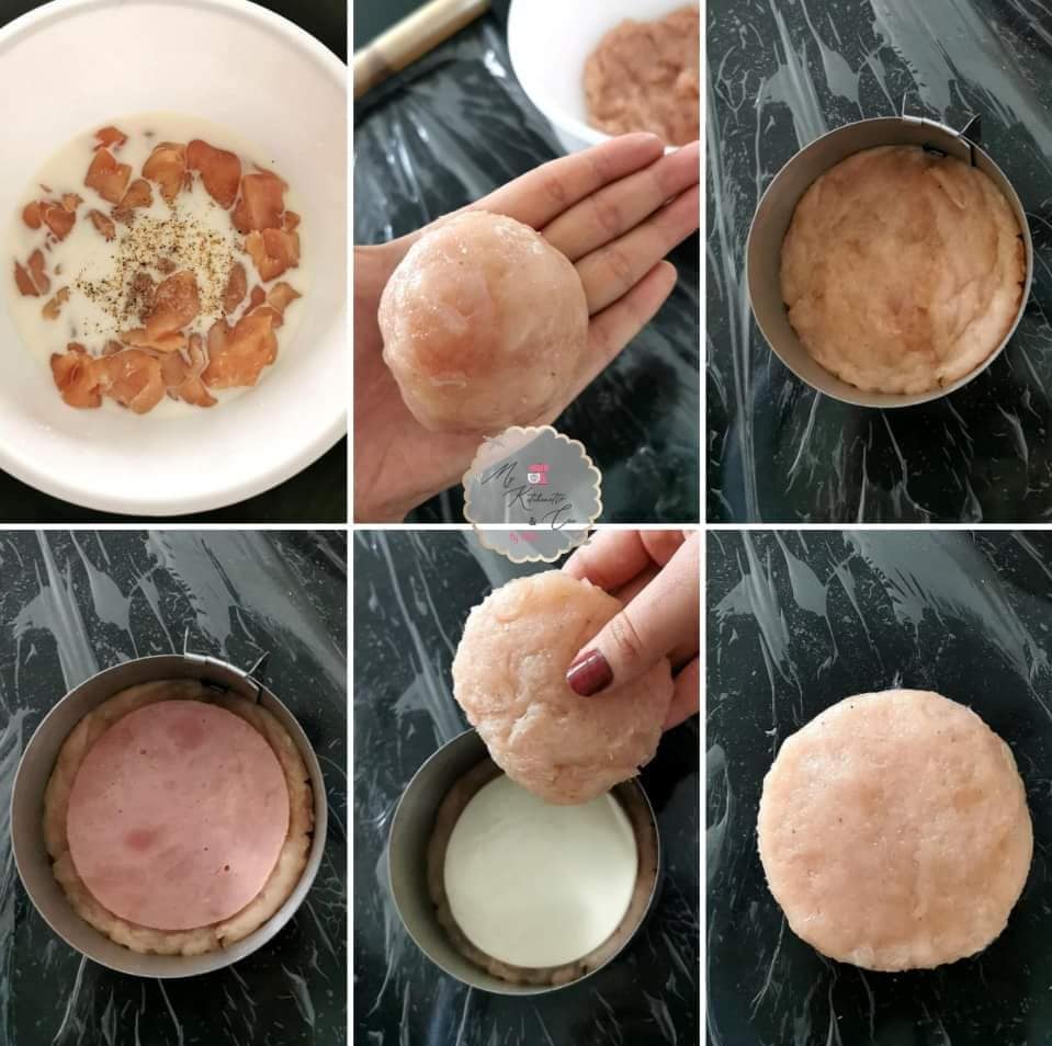 3.Sur du cellophane, placez un emporte pièce, étalez dans le fond une boule de poulet haché, ajoutez 1 tranche de dinde puis 1 tranche de fromage (détaillées avec l’emporte pièce). Refermez avec une 2e boule de poulet haché. Retirez l’emporte pièce et pincez les bords pour former le cordon bleu et le rendre hermétique. Placez sous cellophane et réservez 30min au congélateur