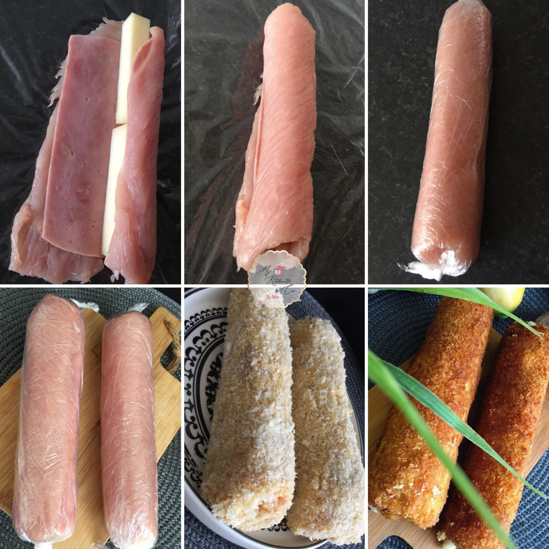Cordon bleu V2 (pour 2 rouleaux) : 2 grandes escalopes de poulet + Fromage Comté en bloc + 2 tranches de jambon de dinde + sel/poivre + 2 oeufs