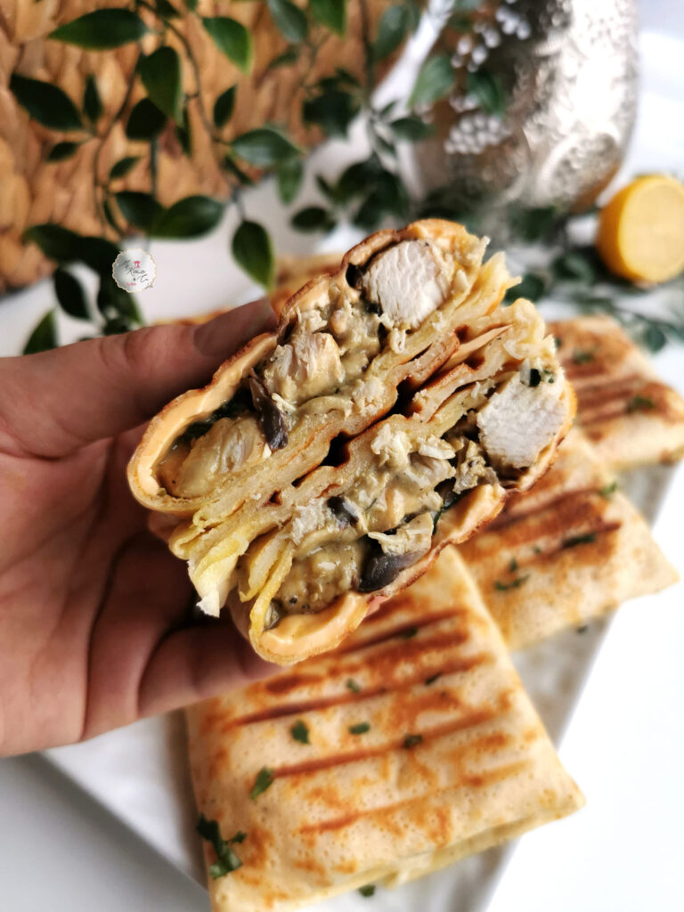 Des crêpes bien moelleuses, avec une délicieuse garniture au poulet et aux champignons, mijotés dans de la crème, le tout sous une pluie de fromage.. Un p’tit tour sous le grill et zouuu plus qu’à déguster!
