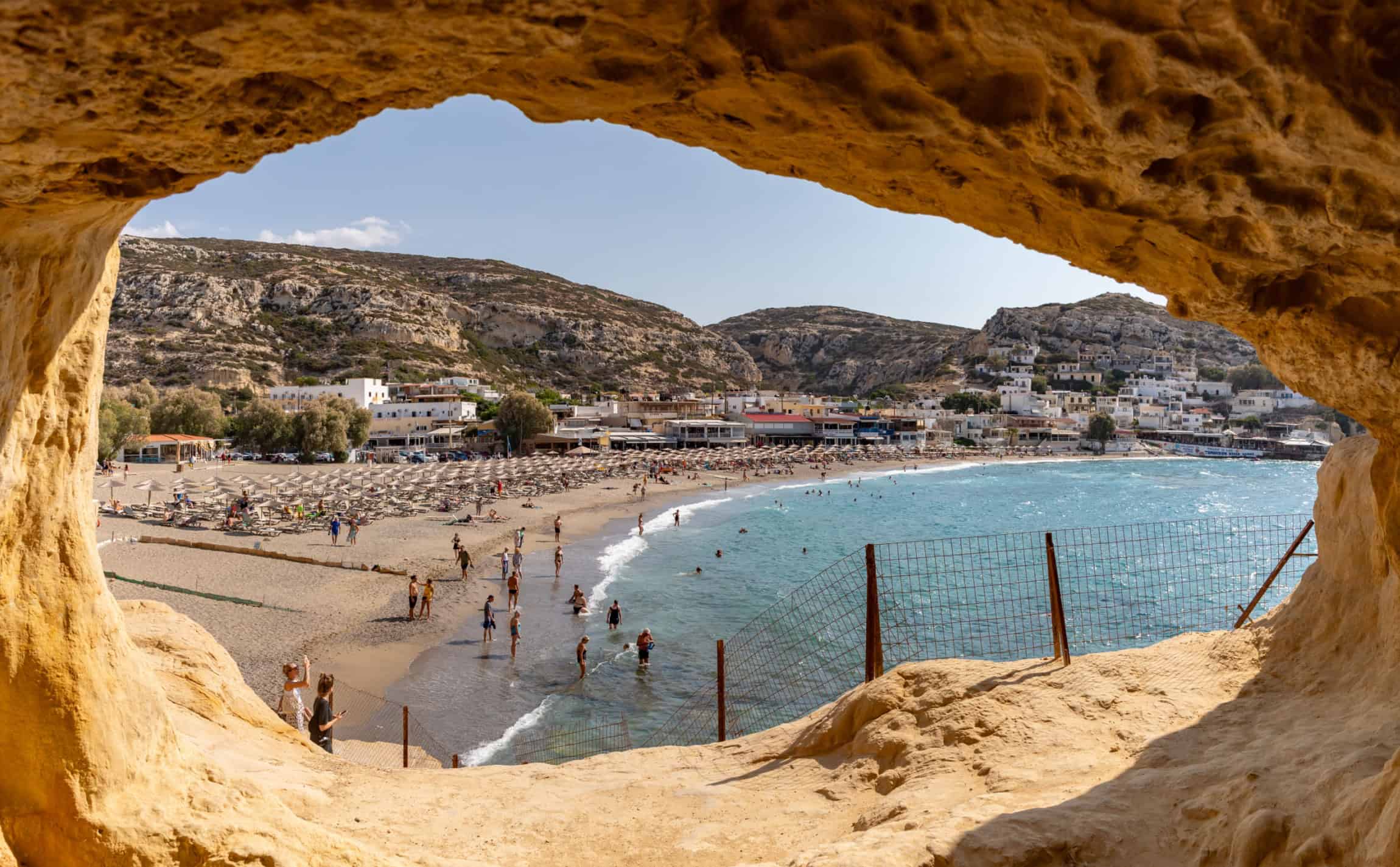 Il y a aussi Matala, qui séduit par sa plage de sable doré bordée de falaises percées de grottes, vestiges de l’époque romaine qui ont ensuite abrité les hippies dans les années 1960. L’eau y est limpide et propice à la baignade, tandis que la vue sur ces falaises mythiques crée un décor unique en Crète. À quelques pas, la célèbre Red Beach, accessible après une courte marche, présente un cadre plus sauvage, idéal pour ceux qui recherchent calme et authenticité.