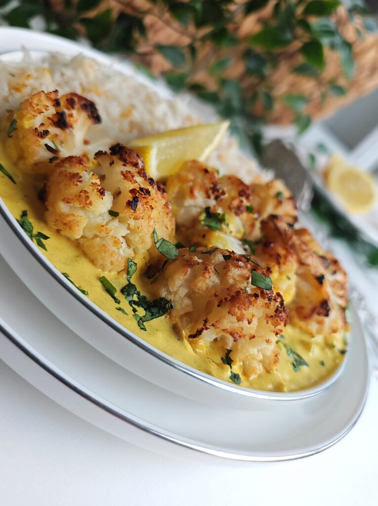 Un délicieux plat végétarien à base de chou-fleur, lait de coco et d’épices, le tout servi avec un bon riz basmati pour un déjeuner parfumé si Mmmmmh !