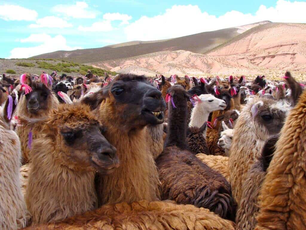 Première étape : grimper ! Nous montons encore et encore, nous enfonçons dans la cordillère des Andes. Les lamas nous regardent paisiblement passer, sans se douter qu’ils seront bientôt affublés de guirlandes et autres décorations pour le carnaval, qui se prépare depuis des semaines.
