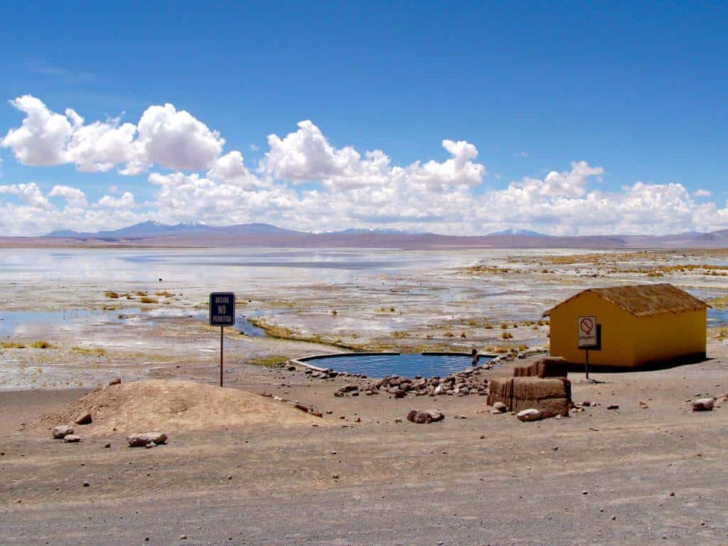 La note aquatique du voyage se poursuit avec l’arrêt fort apprécié à Aguas Calientes, où une petite piscine, construite aux abords d’une lagune, récupère l’eau de sources chaudes, avec une température de 38°C ! Ce bain « rafraîchissant » étant notre unique contact avec de l’eau chaude pendant notre séjour désertique, nous en profitons un peu !
