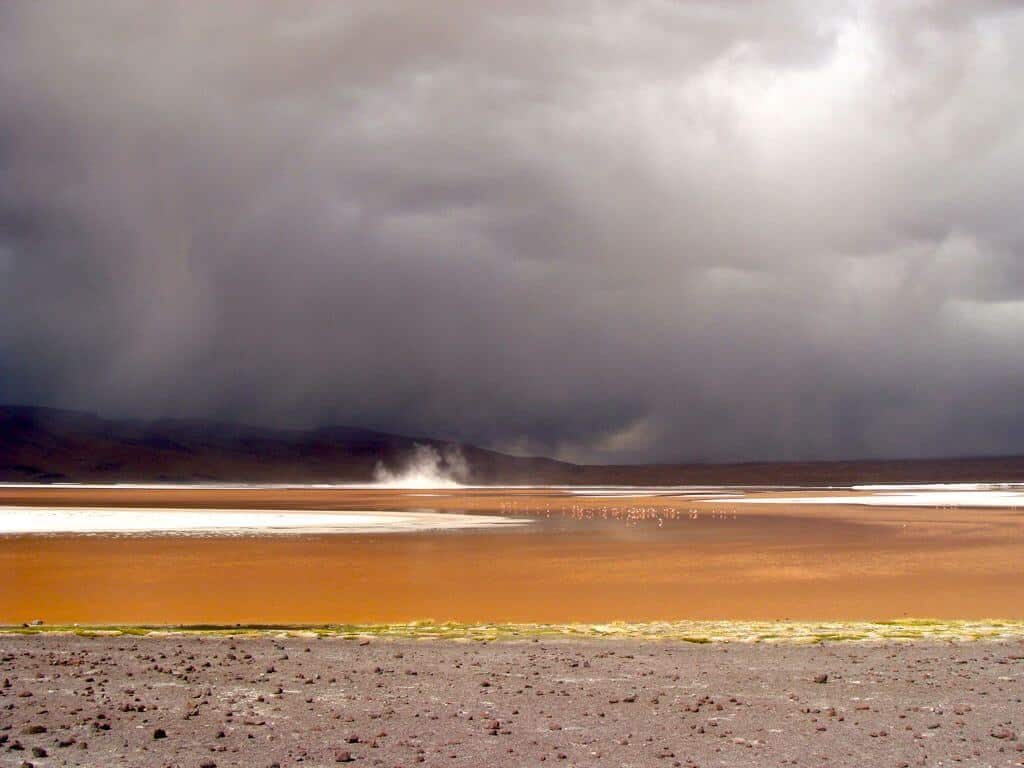 Sinon, toujours aussi splendide ce salar. Ça semble être assurément un lieu qui marque les esprits, car les articles qui en parlent foisonnent sur les blogs de voyage. Mais on ne s’en lasse pas, enfin là, je parle pour moi bien sûr ! Je n’avais par contre jamais vu cette laguna aux eaux rouges. La photo est splendide avec ce ciel menaçant. Comme quoi, il ne faut pas nécessairement un ciel bleu pour faire de belles photos.