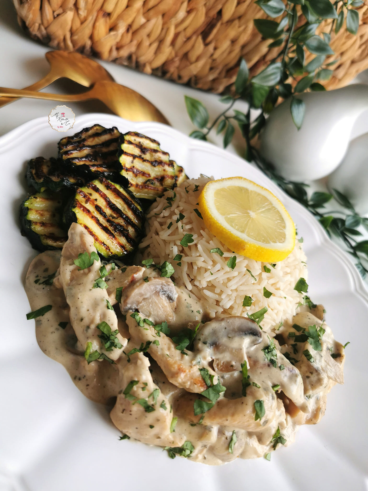 Du poulet et des champignons dans une sauce crémeuse à l’ail et aux fines herbes le tout accompagné de courgettes croquantes.. Un délicieux plat simple, rapide et complet !