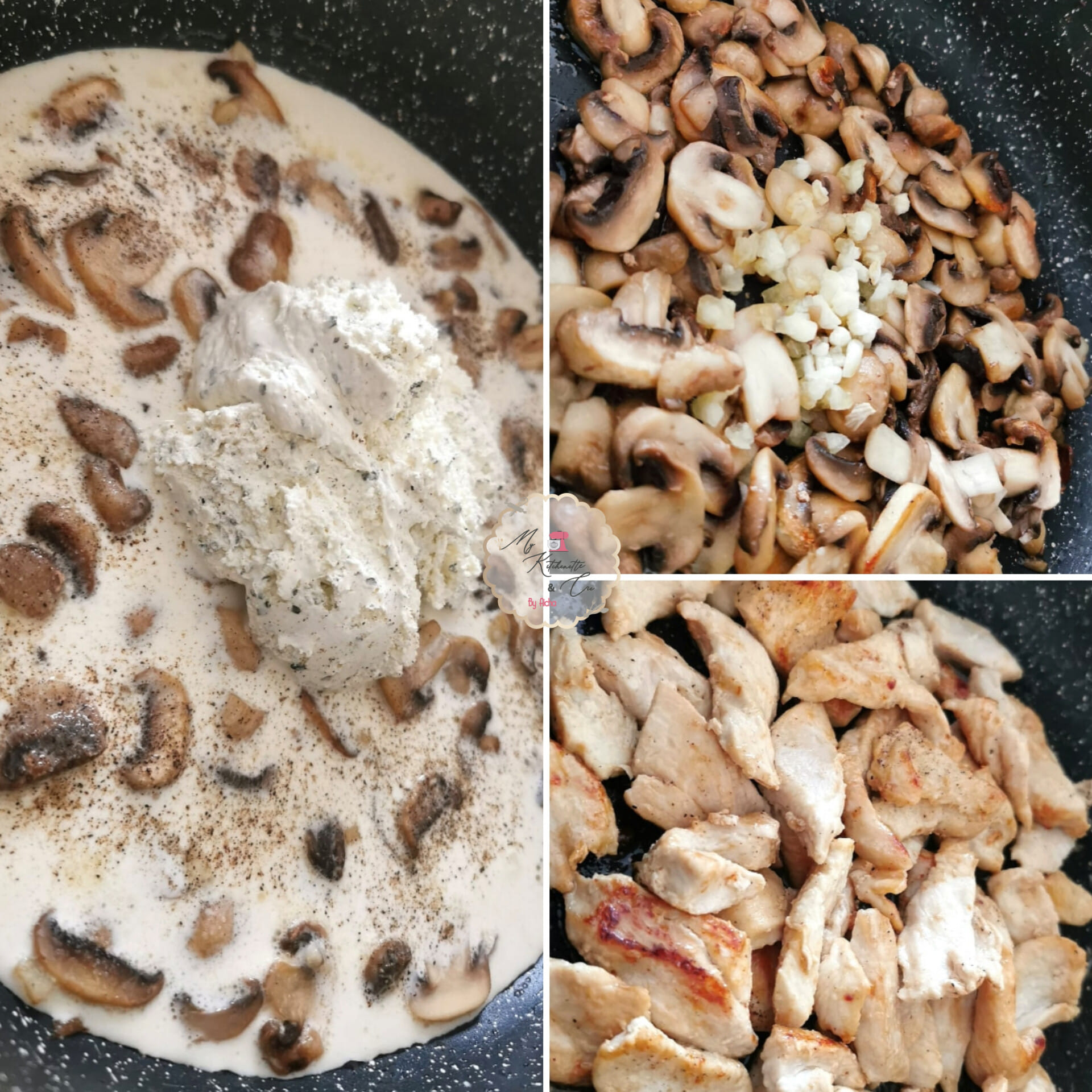 Emincé de poulet sauce boursin champignons : 300gr d’escalopes de poulet + 250gr de champignons frais + 3cs de Boursin ail & fines herbes + 30cl de crème liquide 30%mg + 2 gousses d’ail + 20gr de beurre + 1cs d’huile neutre + sel/poivre