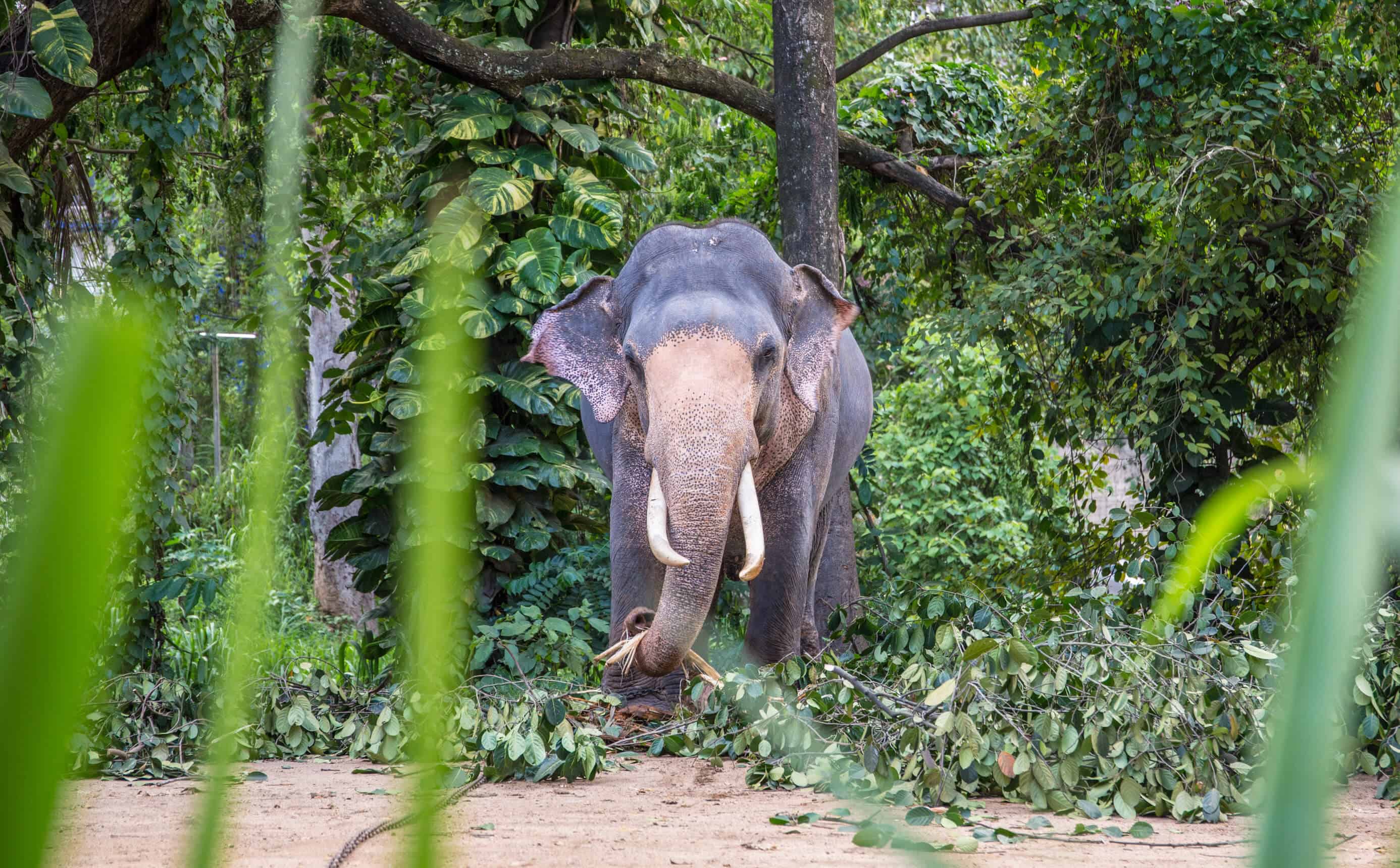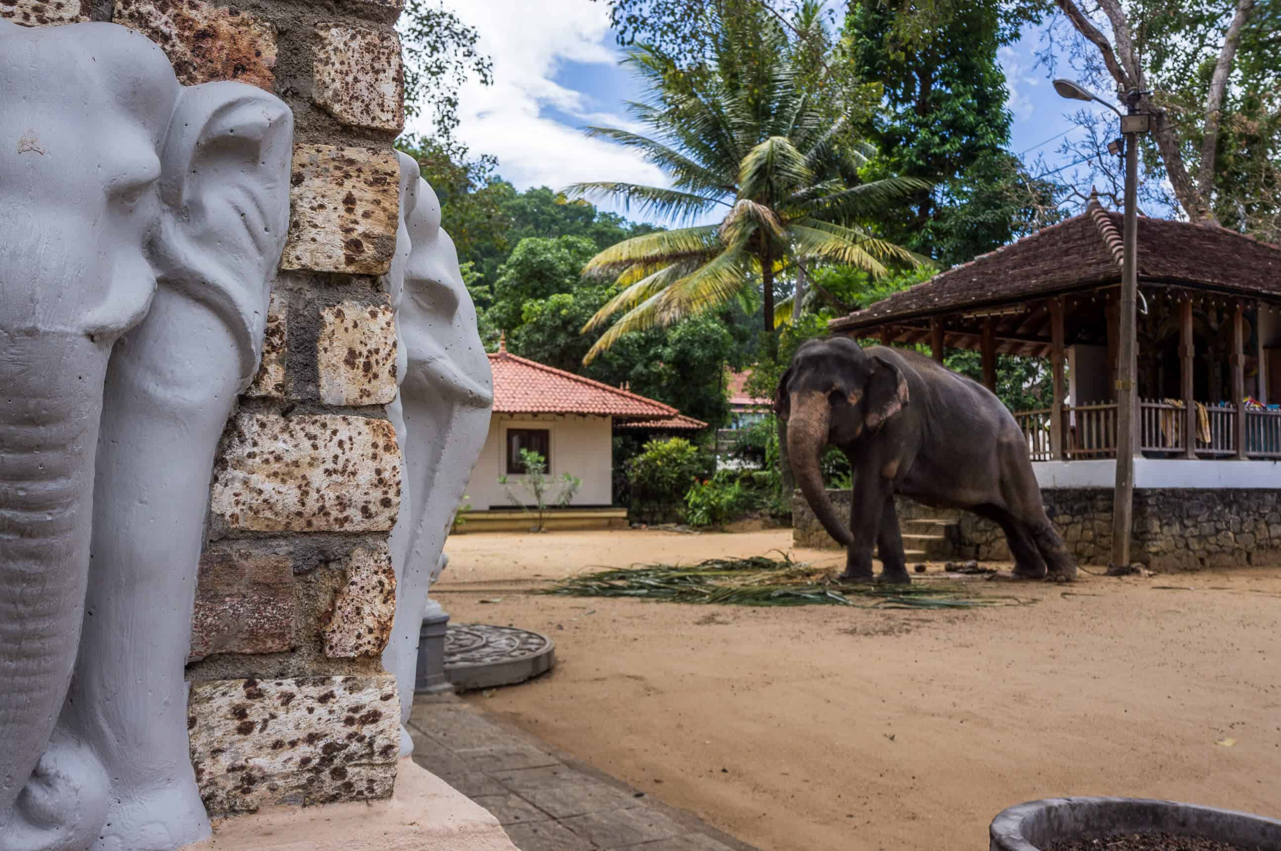 Imposants éléphants transportant le substitut de la Dent Un éléphant attaché aux abords de la ville, en attente des processions Éléphant attaché dans l’enceinte du Temple de la Dent Passager sur éléphant muni d’un crochet -