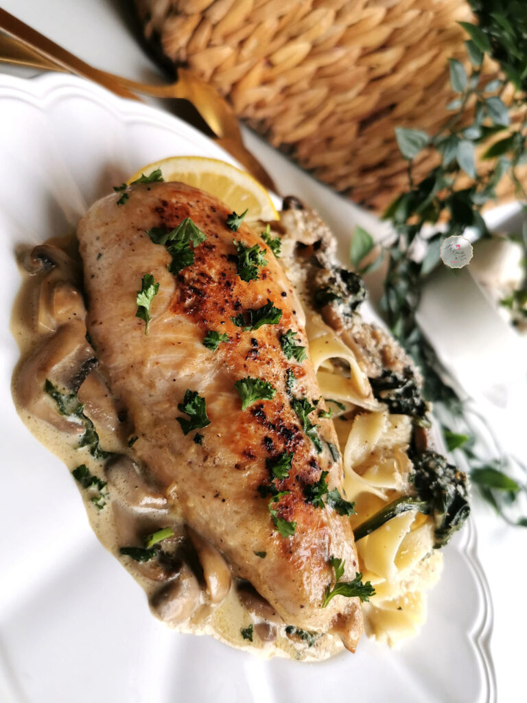On craque donc pour ce savoureux filet de poulet doré qui finit sa cuisson dans une sauce crémeuse aux champignons et aux épinards, le tout servi avec de bonnes tagliatelles. Mmmm un délice