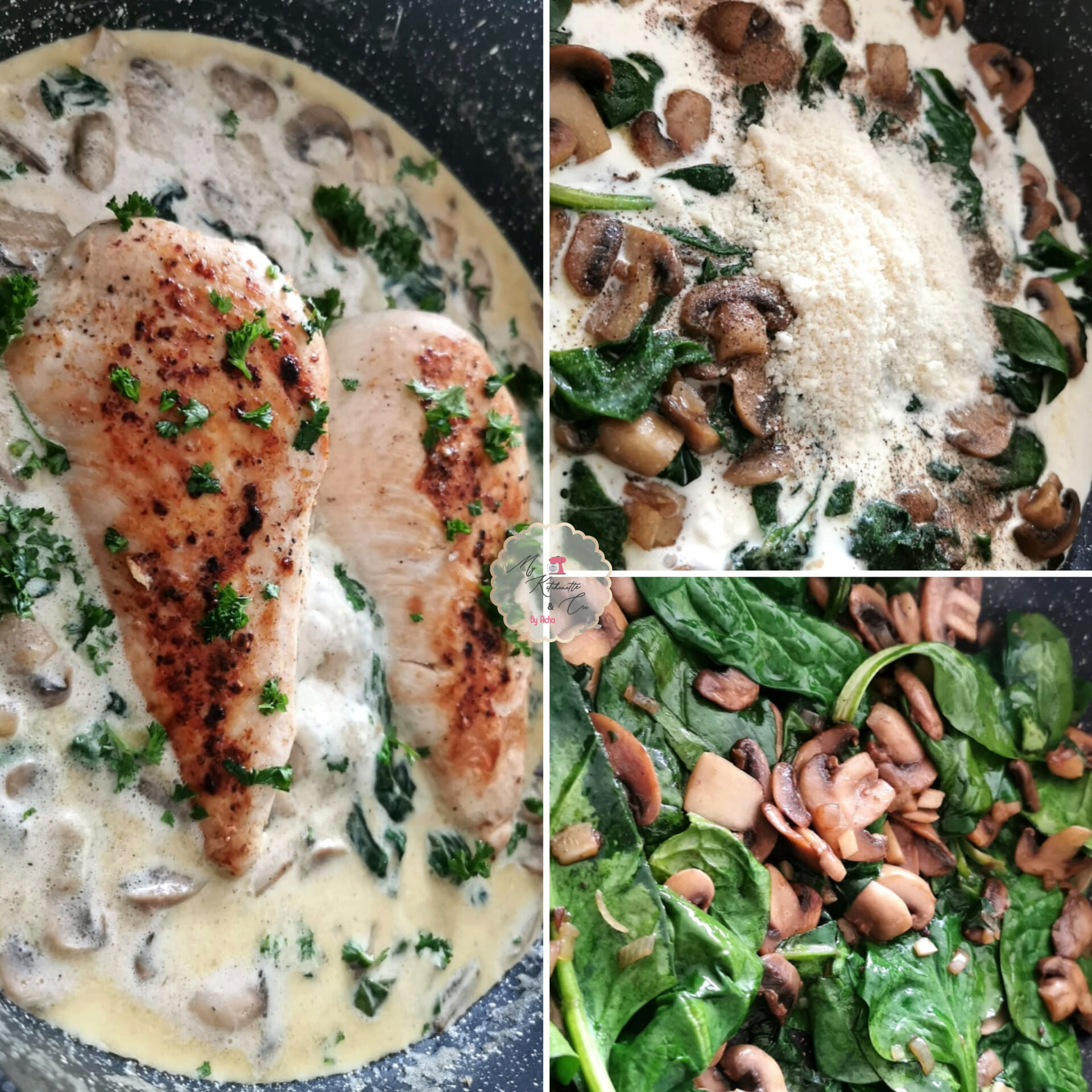 2 filets de poulet + 250gr de champignons frais de paris + 150gr de jeunes pousses d’épinard + 30cl de crème liquide 30%mg + + 1 échalote + 2 gousses d’ail + 2cs de parmesan en poudre + 20gr de beurre + 1cs d’huile neutre + sel/poivre
