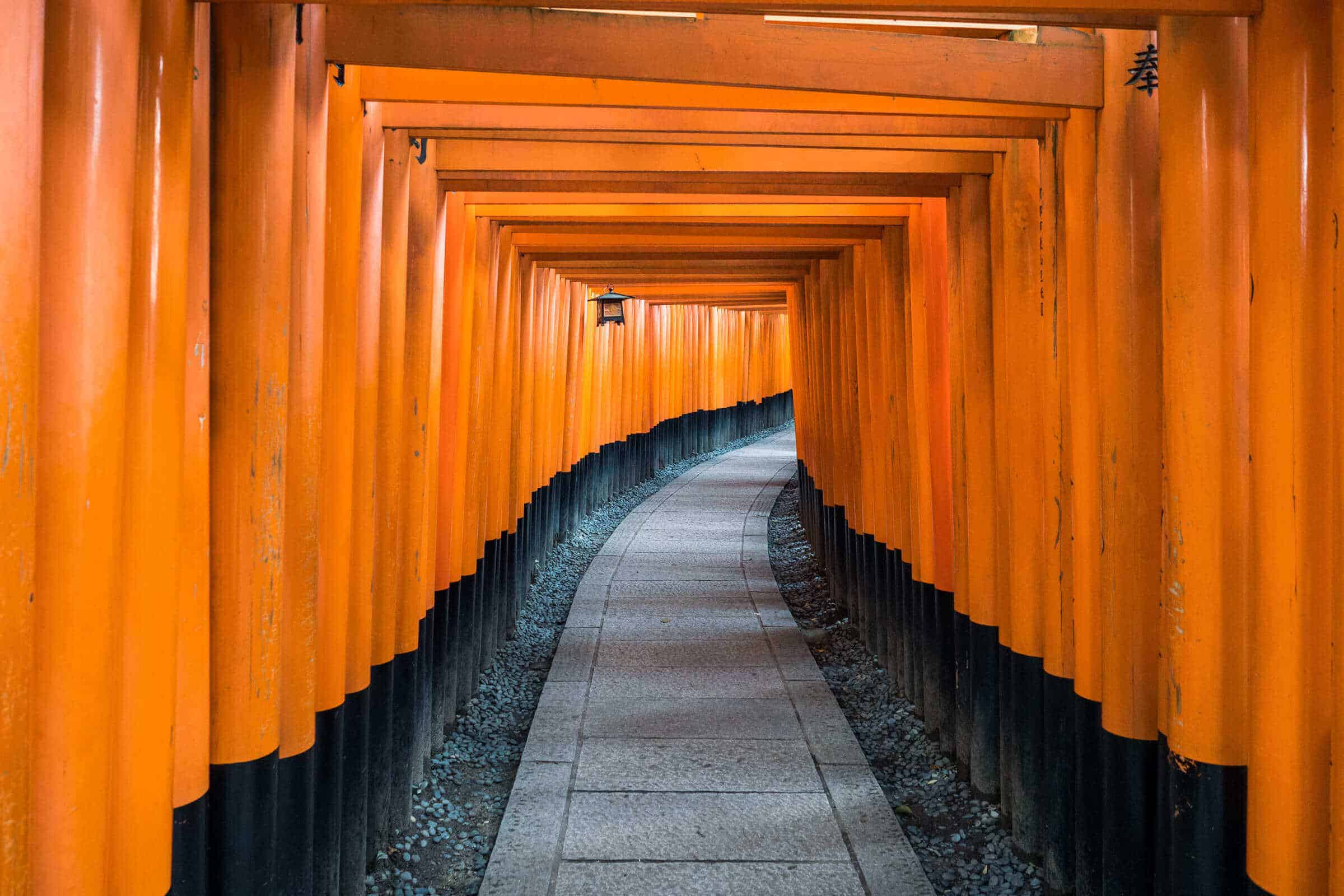 Sanctuaire shinto (religion antérieure au bouddhisme au Japon, rassemblant des croyances très anciennes mêlant polythéisme et animisme) dédié au dieu Renard (Inari), dieu autrefois prié par les cultivateurs pour bénéficier des récoltes et aujourd’hui principalement honoré par des hommes d’affaires dans l’espoir de contrats juteux. Partout à Fushimi Inari, des statues de renard observent passer les marcheurs d’un air espiègle.