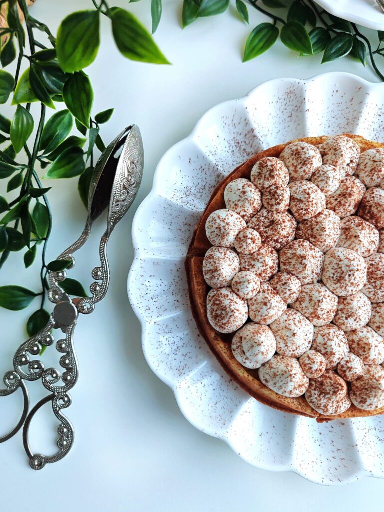 Une généreuse gaufre épaisse, moelleuse à l’intérieur, croustillante et dorée à l’extérieur avec sa mie légère et aérée que l’on vient imbiber de café. On poche ensuite le dessus avec une crème légère chantilly/mascarpone et on saupoudre le tout de poudre de cacao.. 100% comfort food