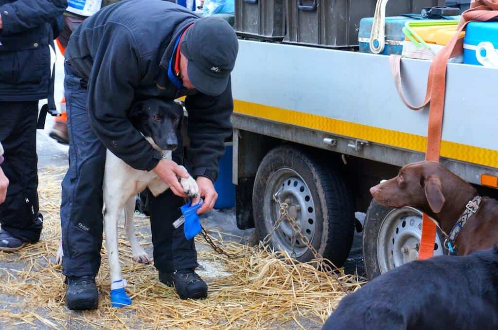 Quelques gestes sont répétés avant chaque course, pour veiller au confort et au bien-être des chiens, par les handlers et vétérinaires.