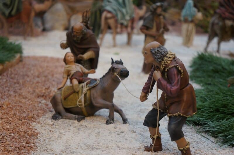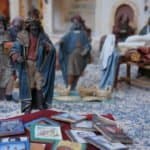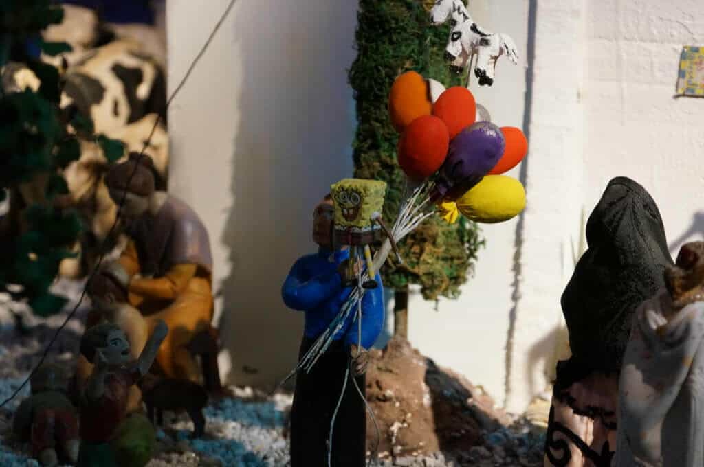 J’aime rechercher dans ces villages de figurines les coutumes typiquement espagnoles dissimulées dans ces reconstitutions de scènes bibliques. Je repère les femmes dansant le flamenco, les hommes aux costumes traditionnels, les maisons d’époque, … Mais avec François, nous aimons également porter attention aux anachronismes et clins d’yeux dispersés ça et là : les moutons qui se chevauchent, le ballon Bob l’Eponge, les africains qui vendent des CD de musique dans la rue, le petit Jésus roulant en tricycle …