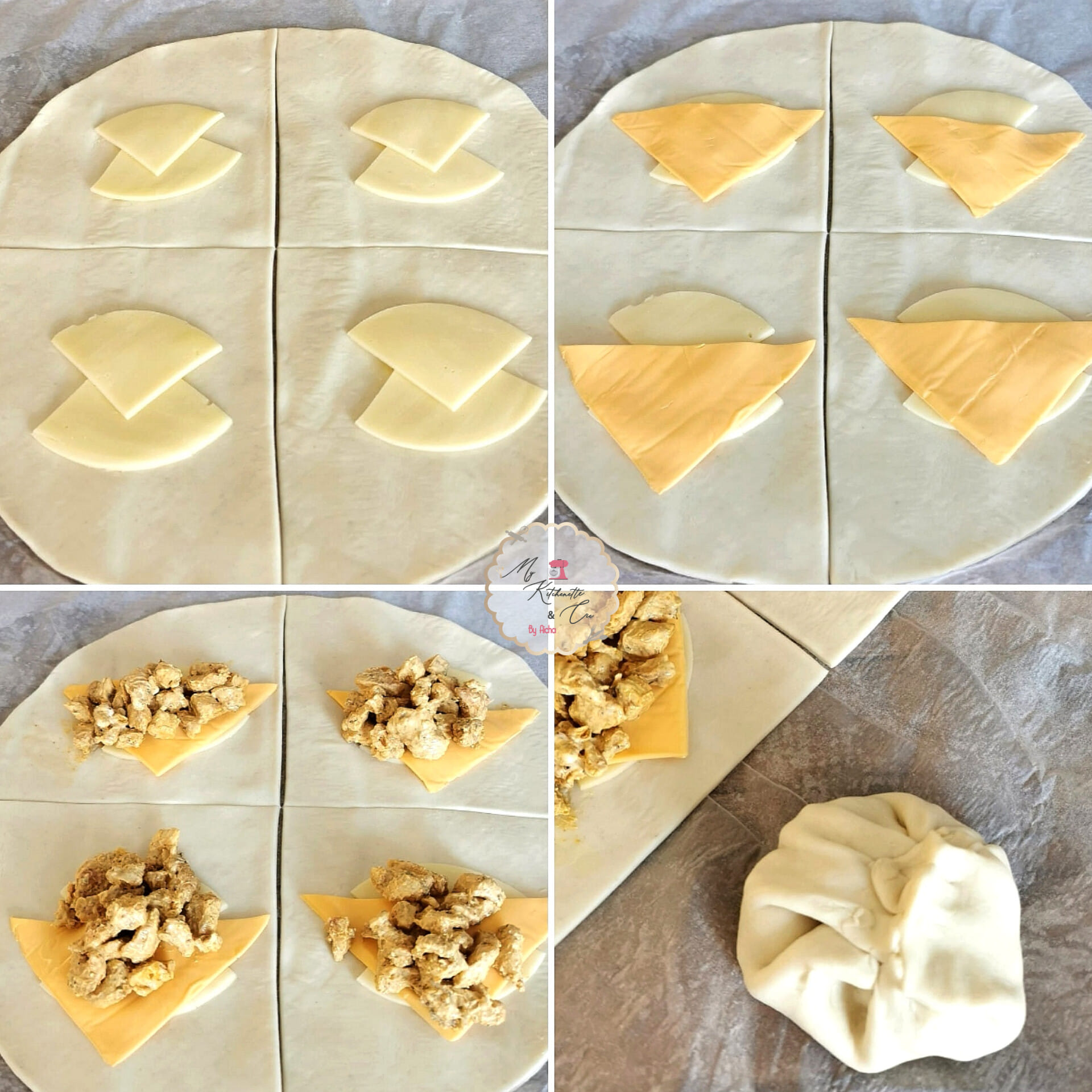 4.Sur chaque part, disposez 1 /2 de mozzarella, 1/2 tranche de cheddar et un peu de farce au poulet