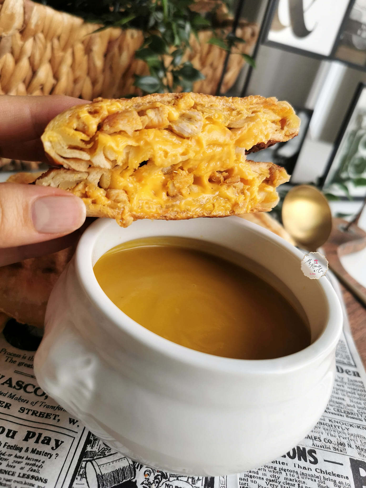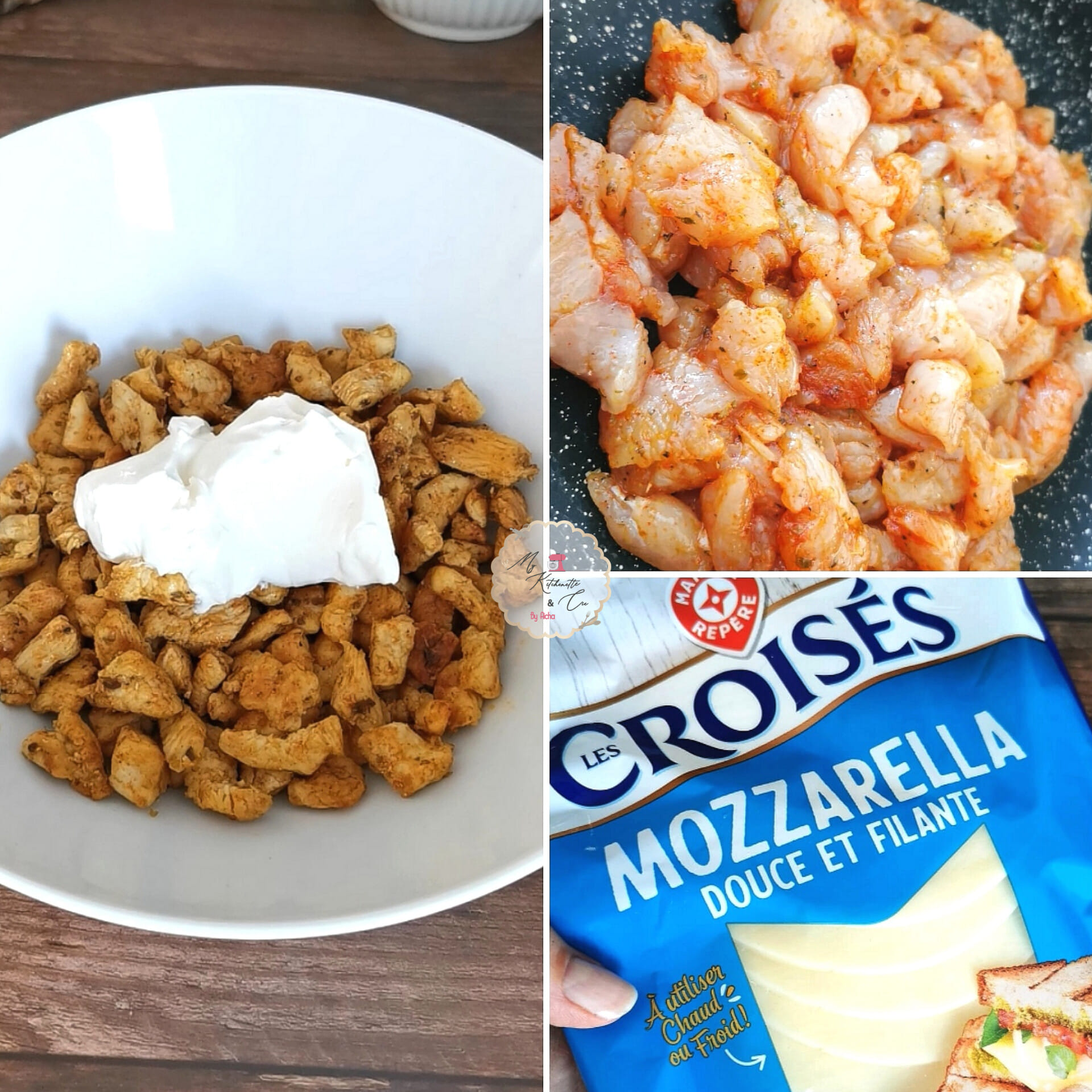 2 rouleaux de pâte à pizza (pas de pâte brisée ou feuilletée) + 300gr d’escalopes de poulet + 1cs d’huile neutre + 1/2cc de curry + 1/2cc de piment + 1/3cc d’origan + sel/poivre + 1cs de crème fraîche en pot + 4 tranches de cheddar + 4 tranches de mozzarella spécial sandwich/panini