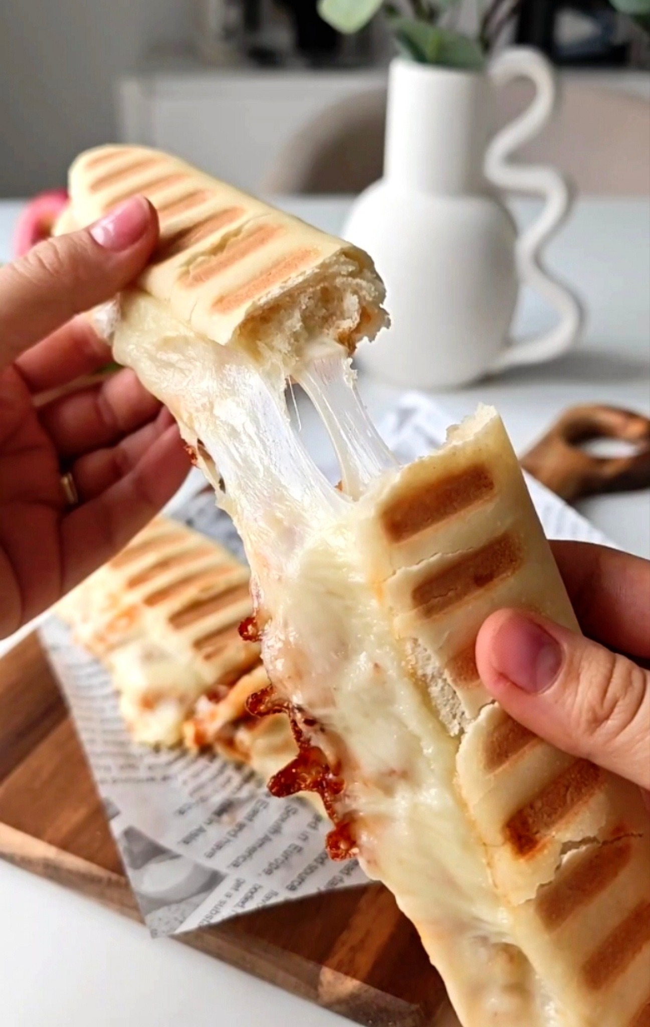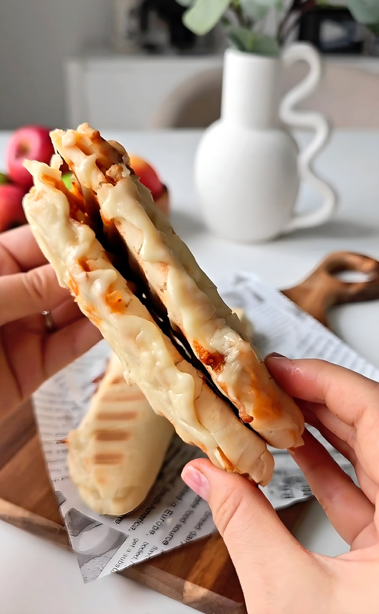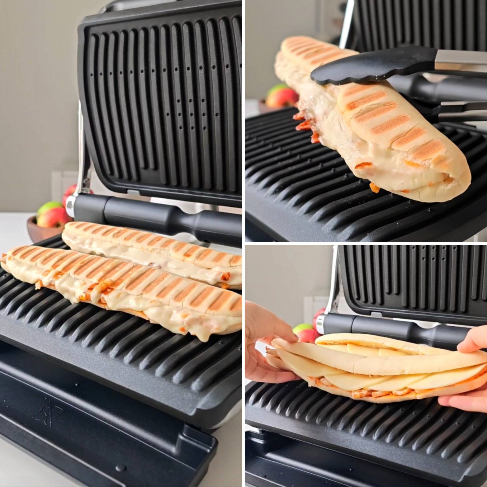 11. Ouvrez les pains, étalez la sauce,ajoutez poulet, fromage,refermez, placez sous le grill