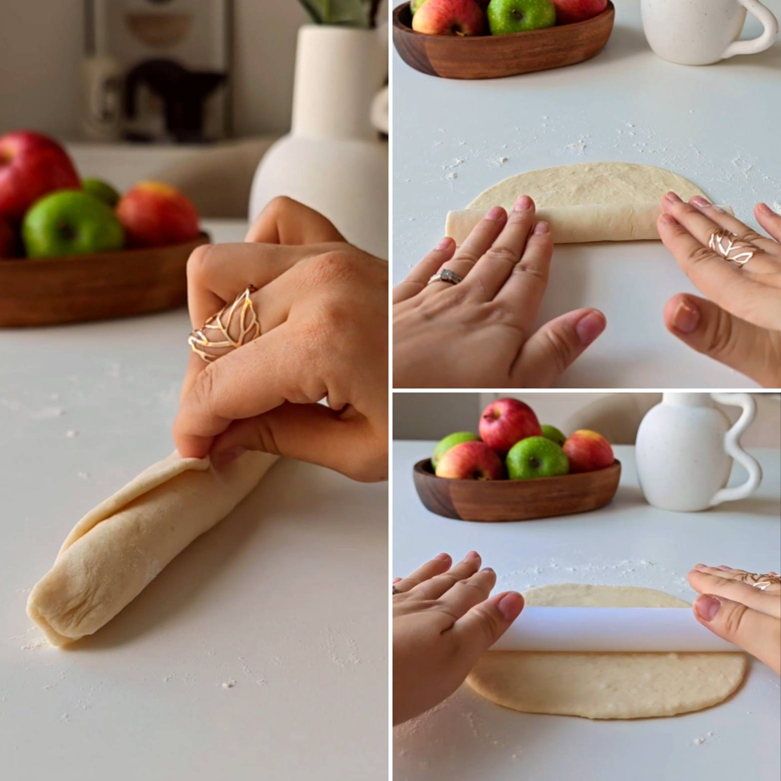 7. Étalez chaque boule en un rectangle arrondi à l’aide d’un rouleau puis roulez la pâte afin de former un boudin. Pincez bien les bords, retournez le boudin, appplatissez au rouleau en gardant une épaisseur d’1cm