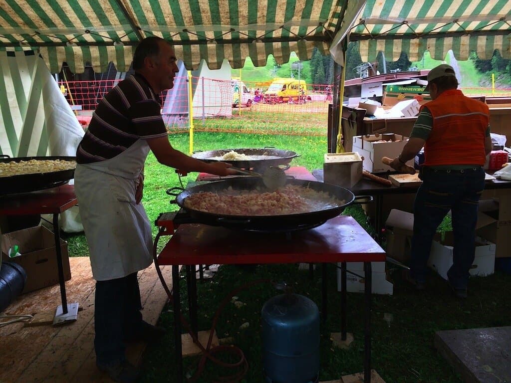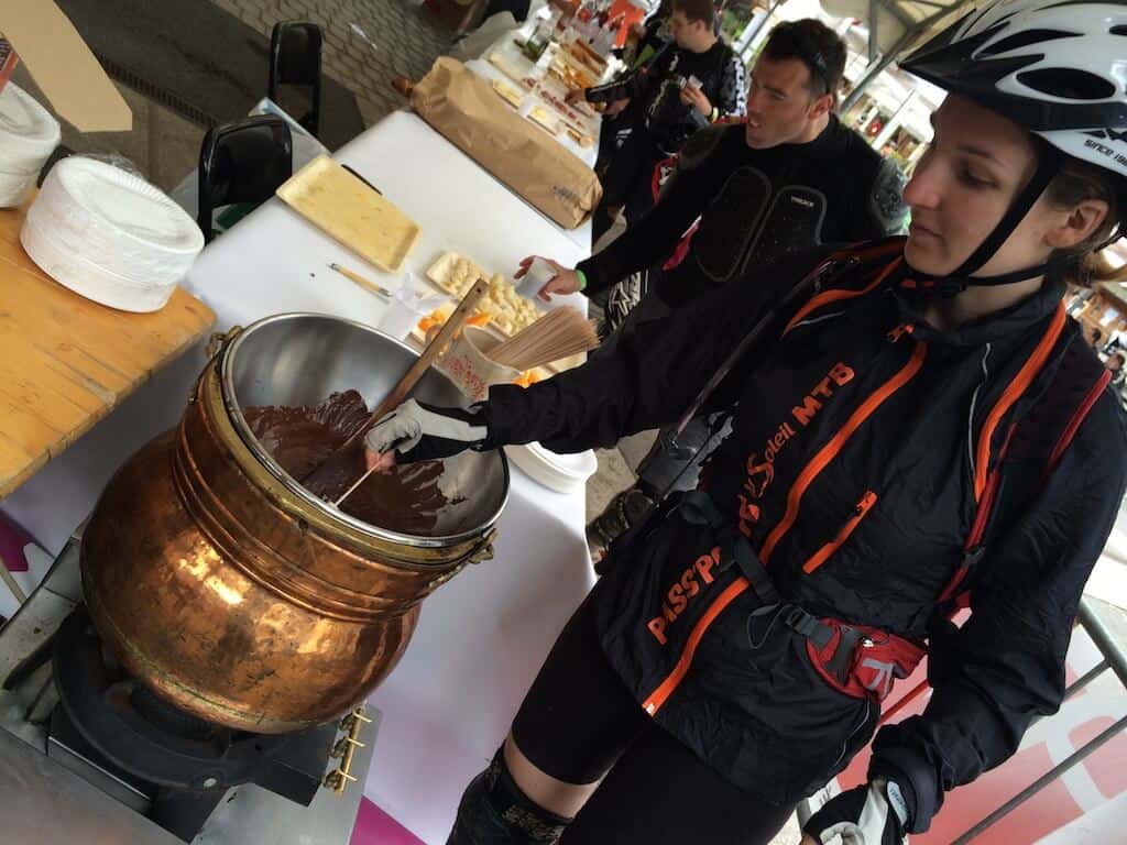Car après l’effort, le réconfort : des tartiflettes géantes nous attendent pour nous revigorer ! Quel plaisir aussi de manger des fruits … et de se laisser tenter par la fondue au chocolat (j’avoue, je suis passée deux fois par la casserole de chocolat !).