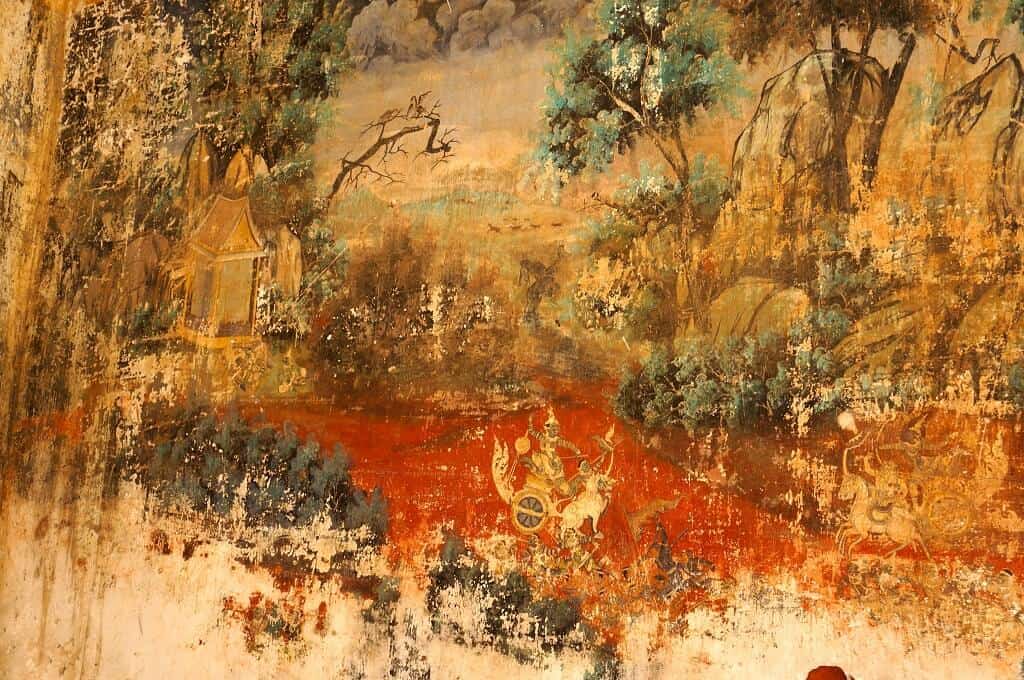 - la fresque murale de l’enceinte entourant la Pagode d’argent (Preah Keo) malgré son mauvais état général : un vrai livre ouvert sur la culture et la religion cambodgienne, qui retrace le récit du Râmâyana (épopée mythologique fondamentale de l’hindouisme),