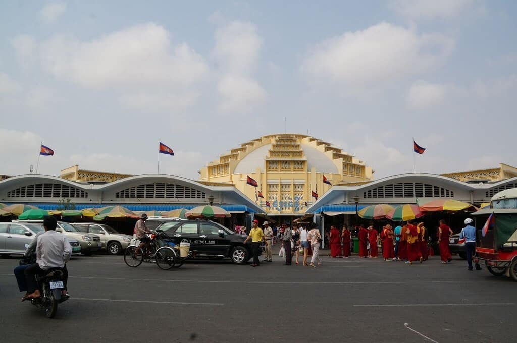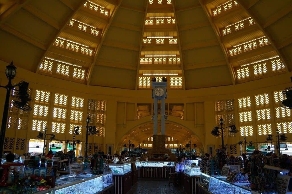 Au centre de la capitale, ce marché circulaire occupe un étrange bâtiment de style Art déco (datant de 1937). Avec un dôme immense (un des plus grand au monde) recouvrant le hall central, il a bien mérité son nom « Phsar Thom Thmey » signifiant « nouveau grand marché ».