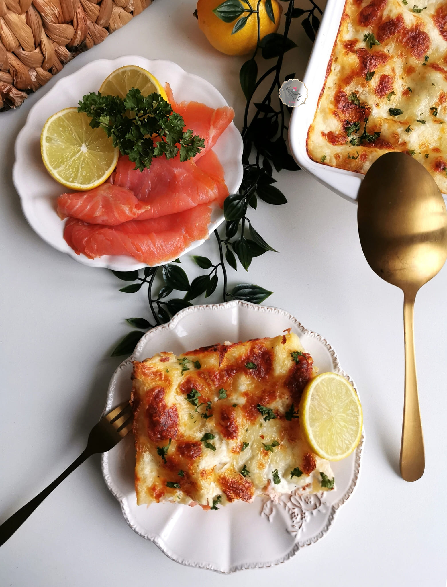 De délicieux morceaux de saumon fondant, des lanières de saumon fumé, une sauce béchamel crémeuse légèrement citronnée le tout sous une pluie de mozzarella gratinée