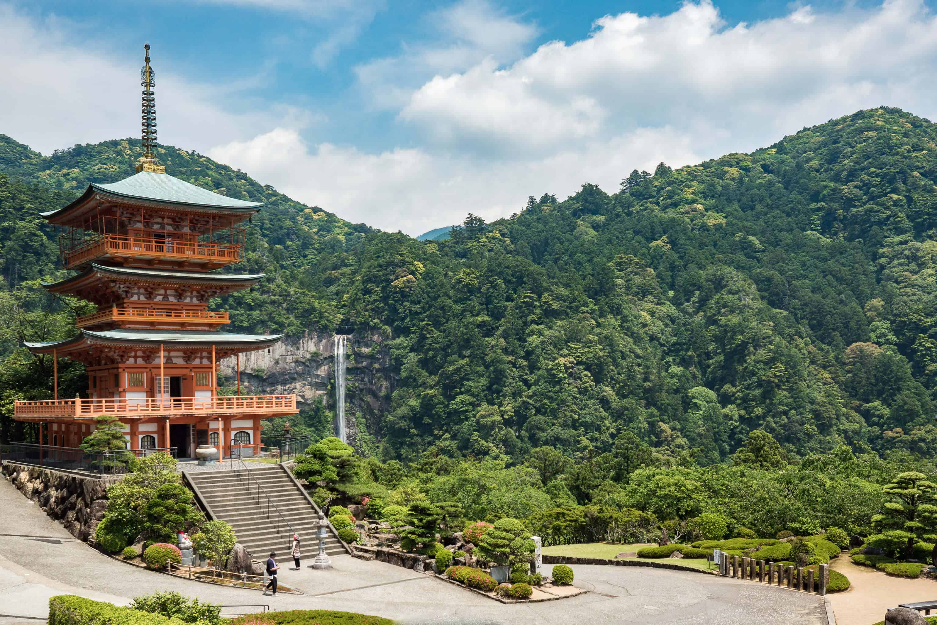 En contrebas du temple se trouve le sanctuaire, Kumano Nachi Taisha, offrant une vue éblouissante sur l’eau qui se déverse à l’infini. Ce sanctuaire a d’ailleurs été érigé en l’honneur de cette cascade (l’une des plus hautes du pays !) et de sa divinité, Nachi no Taki. Il fait partie, lui aussi, des trois temples sacrés du pèlerinage de Kumano et est réputé être le plus ancien de Kumano.