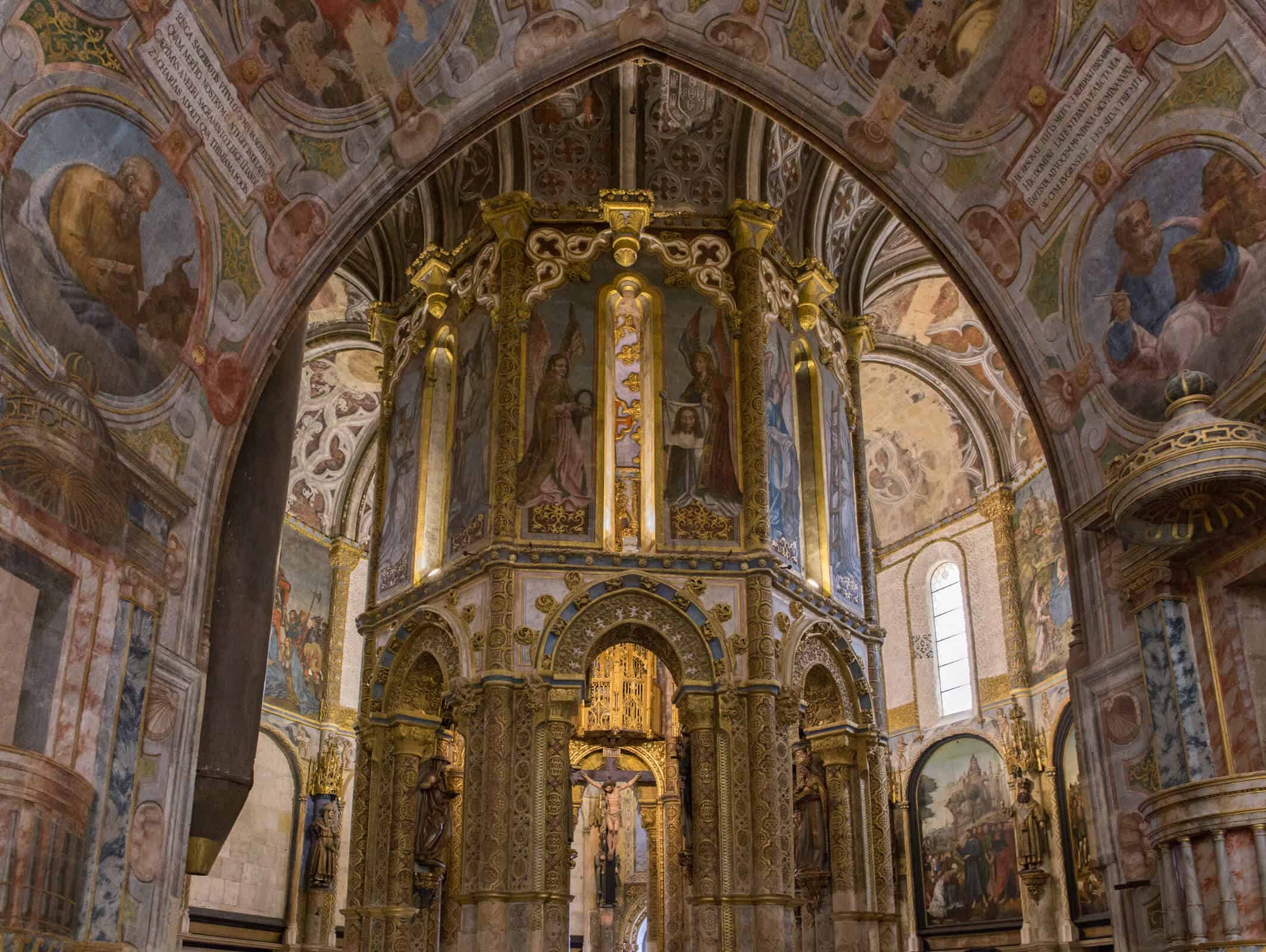 En deux mots : le Couvent du Christ D’abord forteresse des Templiers au XIIe siècle, elle devint un couvent au XIVe avec la dissolution de l’ordre des Templiers, les membres portugais de cet ordre se voyant reconvertis en chevaliers du Christ. Classé Patrimoine Mondial de l’UNESCO en 1983, le Couvent du Christ est l’un des monuments historiques et artistiques les plus importants du pays, témoin de 900 ans d’Histoire.Cette bâtisse, avec ses différentes époques de constructions, a beaucoup d’histoires à nous raconter. Tomar était un véritable carrefour, par lequel tout transitait à l’époque romaine. Et, de ce fait, toute l’Histoire du Portugal est reliée à cette ville… Tout comme le sont toutes les chapelles d’Asie, d’Afrique et d’Amérique sur les territoires de colonies portugaises : toutes bâties selon le modèle de l’église du Couvent de Tomar.