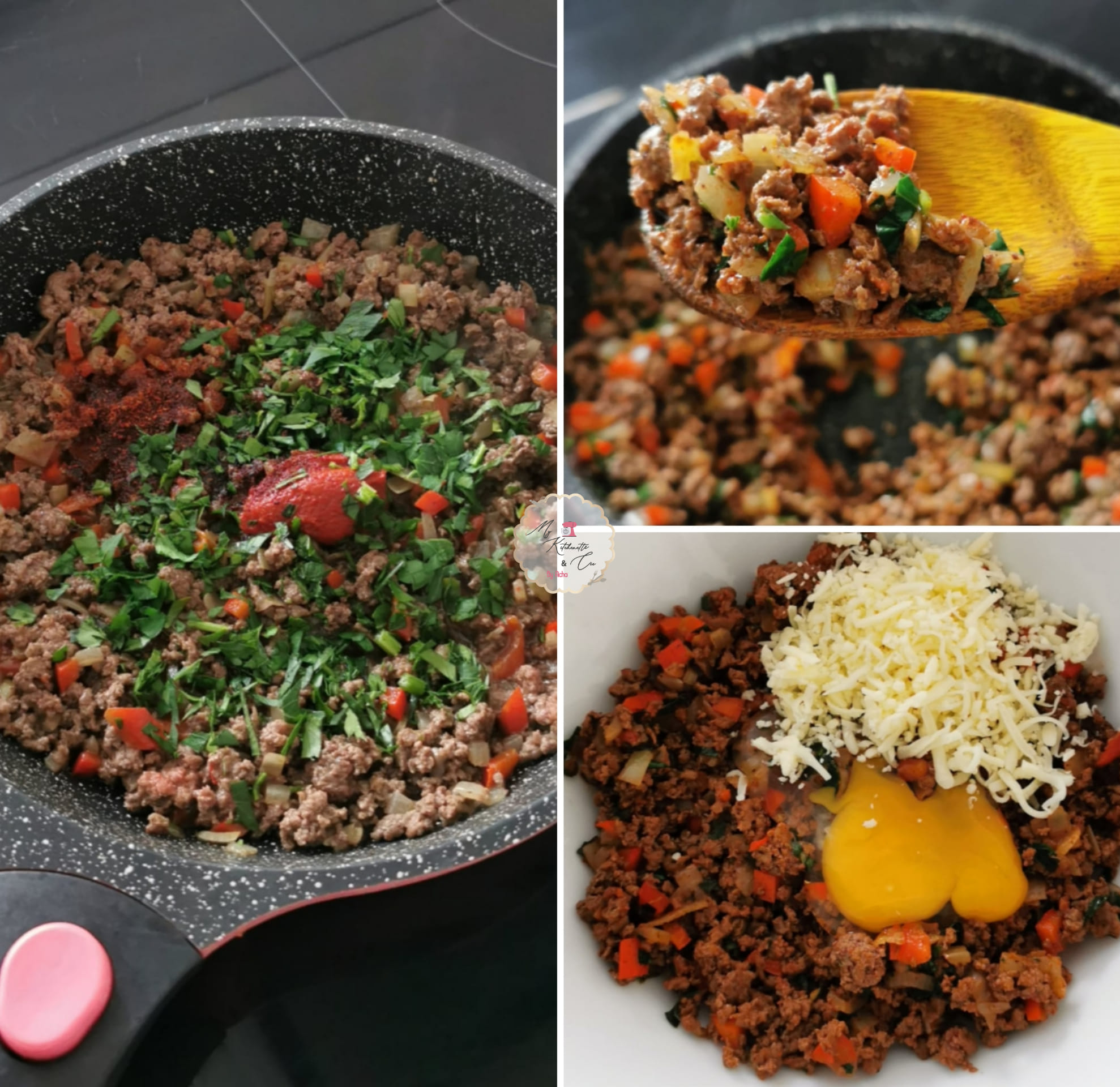 350gr de bœuf haché + 1 oignon + 1 petit poivron rouge + 1 poignée de persil + 2cs d’huile d’olive + 1cc de concentré de tomate + 1/2cc de piment fort (ou paprika) + 1/4cc de Sumac (ou 1cs jus de citron) + sel/poivre + 1 oeuf + 50gr de fromage râpée type mozzarella + 18 feuilles de yufka (triangle) + 1 jaune d’oeuf