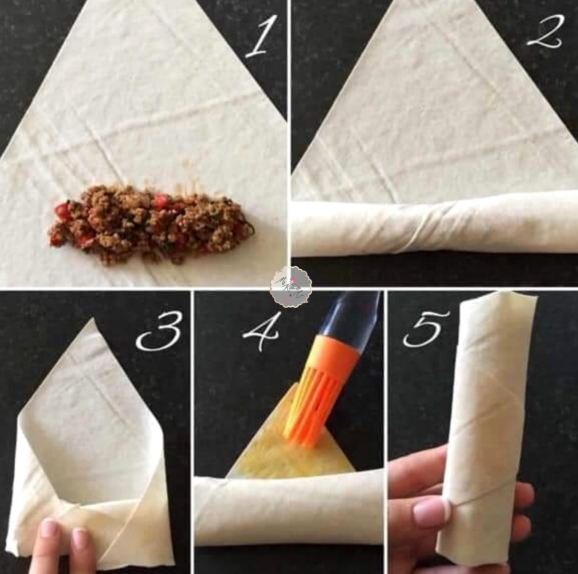 7.Repliez le bas du triangle puis repliez également les deux côtés pour couvrir la farce. Roulez le tout pour former un rouleau