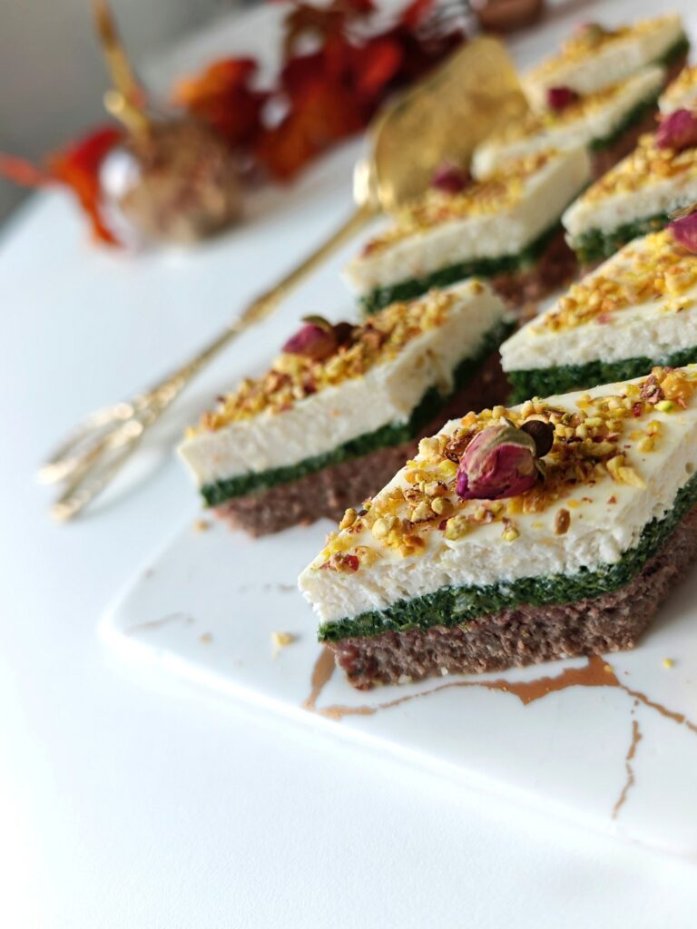 7. À la sortie du four, laissez totalement refroidir avant de démouler. Coupez les extrémités pour un rendu net puis coupez le tajine en losanges et saupoudrez le dessus de pistaches hachées