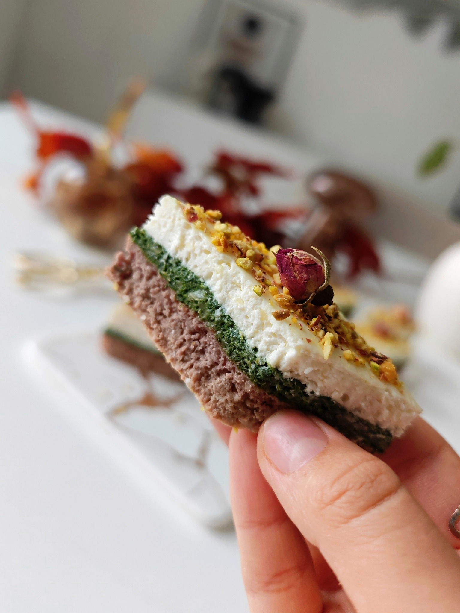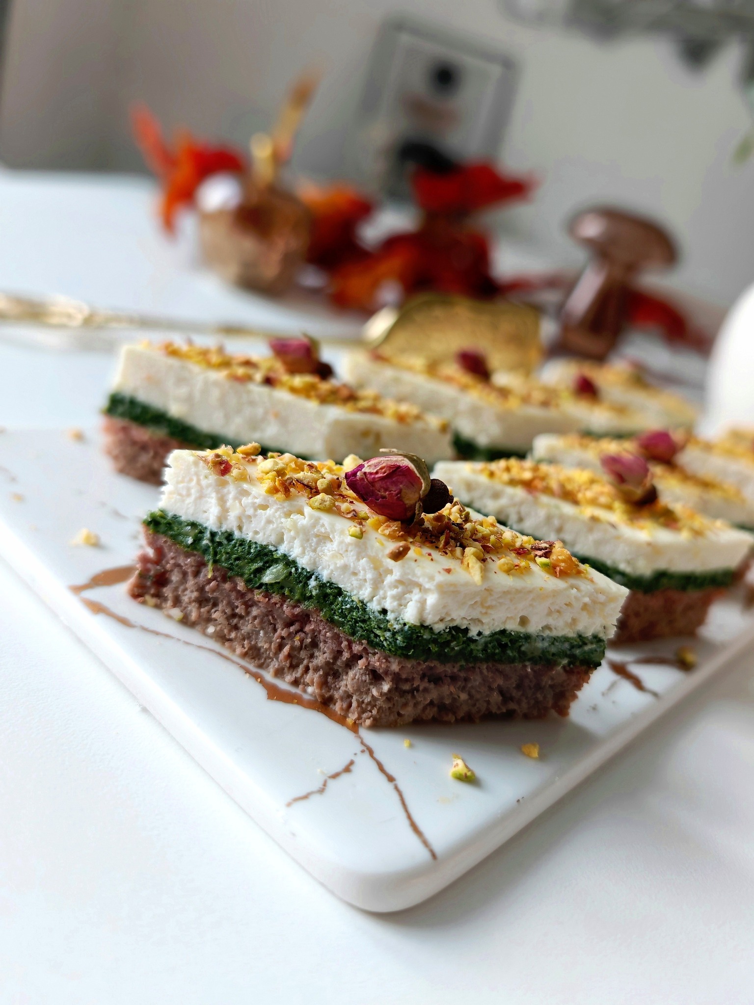 Un tajine raffiné en trois étages, composé de viande hachée, épinards et ricotta (rigouta), délicatement surmonté de pistaches hachées !