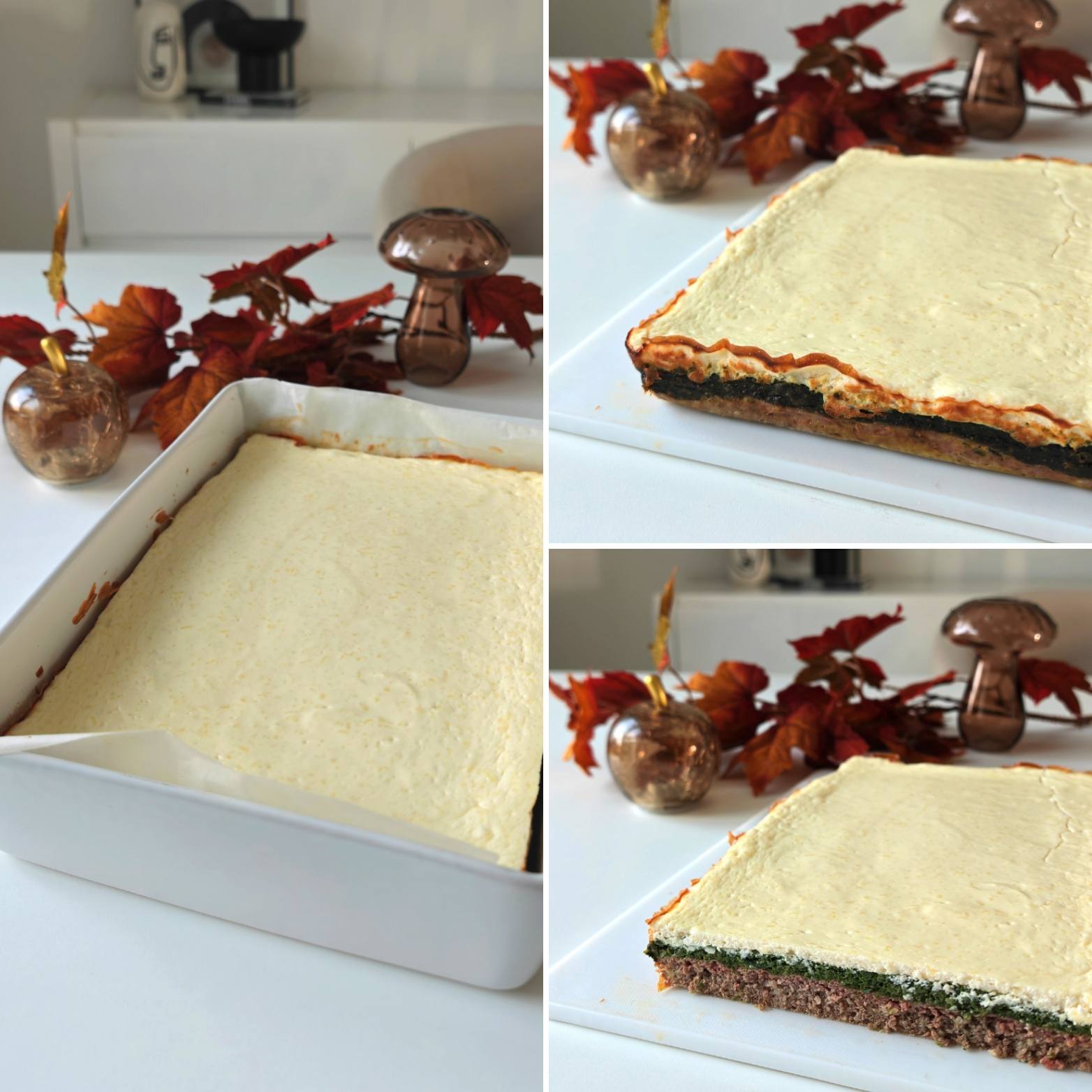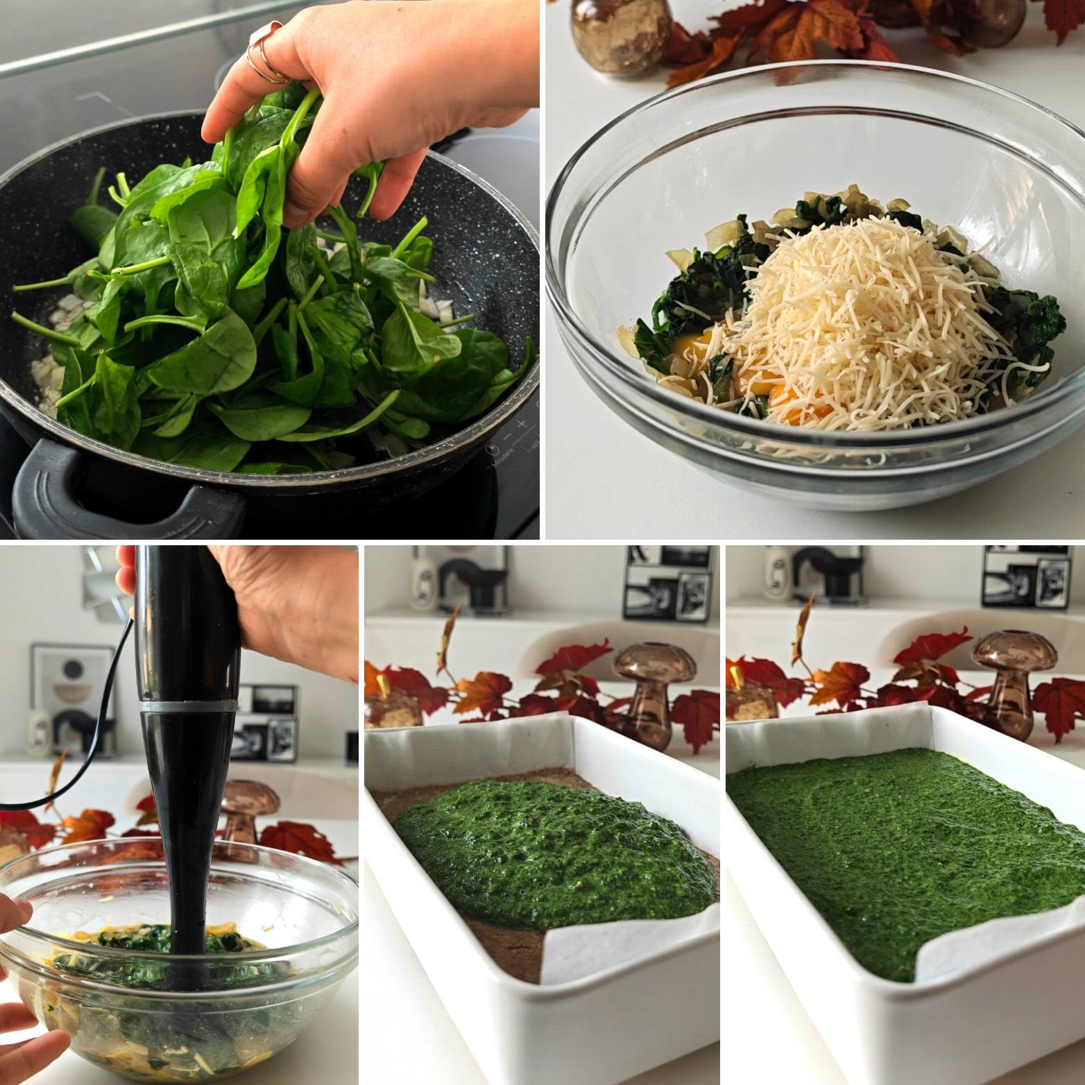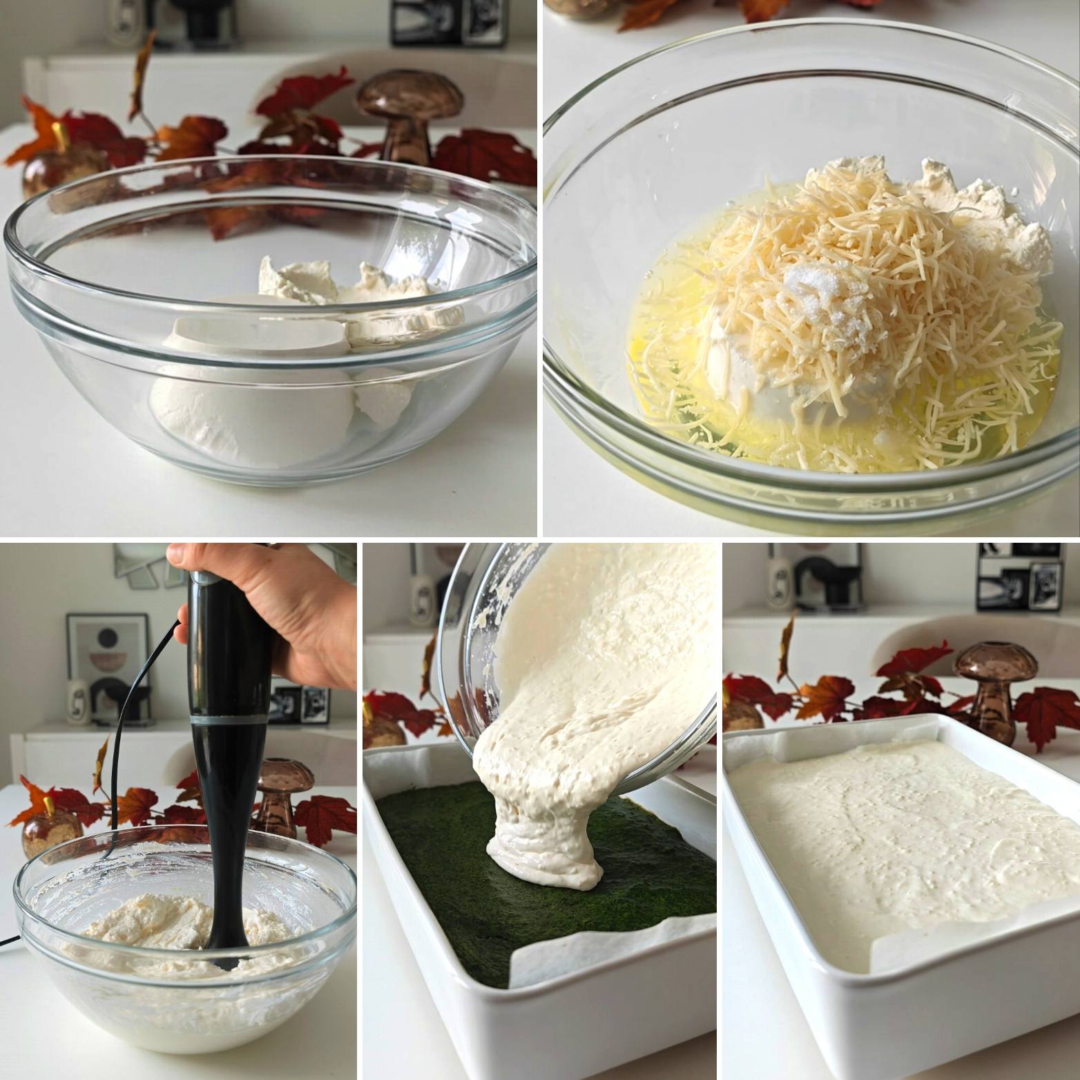 6. Troisième couche : dans un saladier, mélangez la ricotta avec les blancs d’œufs, le fromage râpé, le sel/poivre. À l’aide d’un mixeur, mixez rapidement la préparation pour qu’elle soit « lisse » et homogène. Versez sur la couche prise d’épinards. Enfournez de nouveau pour 10/12min