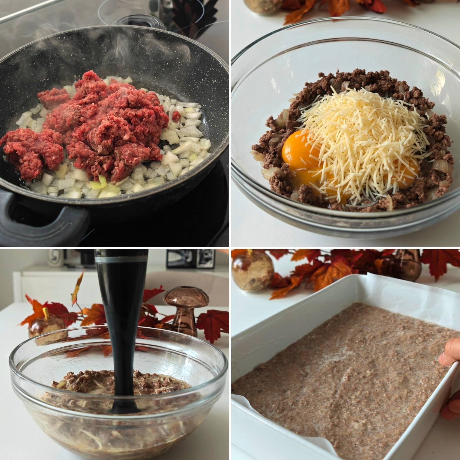 Viande : 400gr de bœuf haché + 4 œufs + 1 oignon + 100gr de fromage râpé (emmental/mozzarella) + 2cs d’huile neutre + 1/4cc de tabel karouia (épice tunisienne) + 1/3cc de piment en poudre (felfel ahmar) + sel/poivre