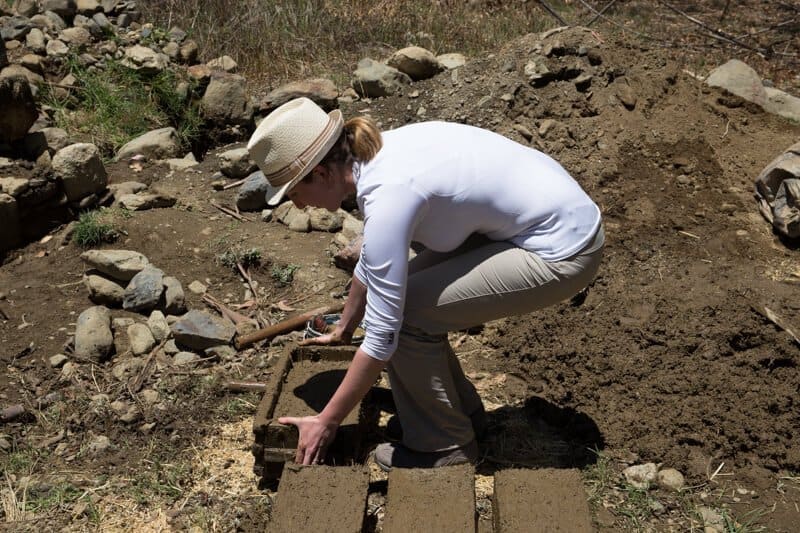 Nous délaissons à présent la maison de pierres au profit de celle en adobe. Leçon suivante : comment fabriquer une brique ? Cristian retourne la terre sur une petite surface, en retire cailloux et racines, et la mélange avec de la paille. L’on ajoute de l’eau et l’on écrase bien le tout, en mode « vendanges », pieds nus dans la boue. Résultat : une terre prête à être façonnée.