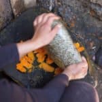 Quelques pierres tombent, Cristian dépose une première couche de pomme de terre. Les plus grandes. Quelques pierres en plus … Et ainsi de suite. Tel un tiramisu mi-pierre mi-pomme de terre, tout se met en place pour la cuisson. Mais ce n’est pas fini. L’on recouvre ensuite le tout de feuilles parsemées d’épis de maïs, puis l’on ajoute une bâche et l’on recouvre le tout de pierre, en prenant bien soin de boucher le moindre trou afin que la fumée ne puisse pas s’échapper.