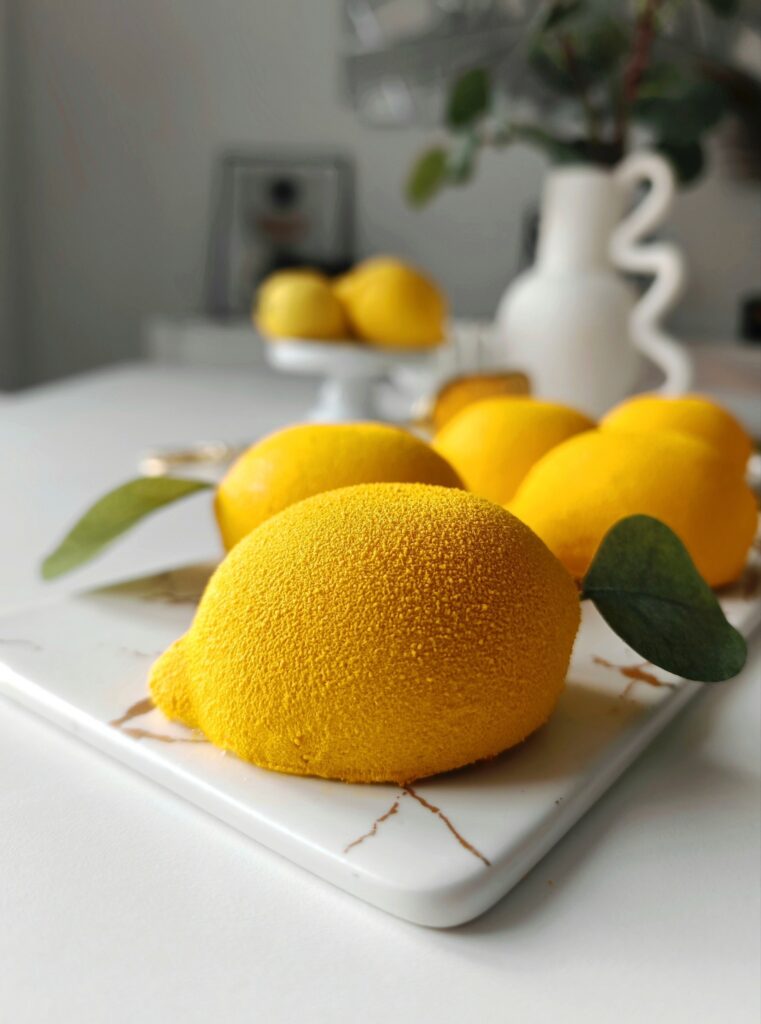 ➡️ Retrouvez y le moule trompe l’oeil Retrouvez y le moule trompe l’oeil citron, fèves yuzu, purée de citron, moule demi sphères (24 de 3cm), le spray velours et la boîte Sorrento