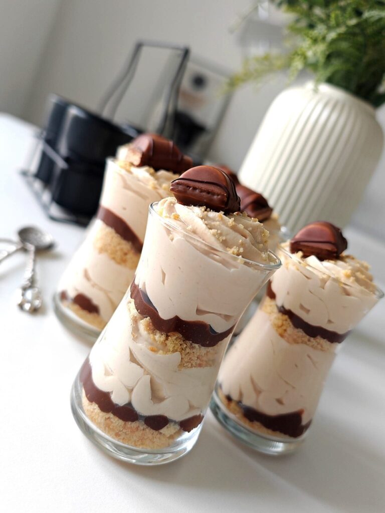 Un fond de biscuits, une délicieuse sauce au chocolat, le tout surmonté d’une crème bueno aérienne. Mmmm 3 couches de pur bonheur !