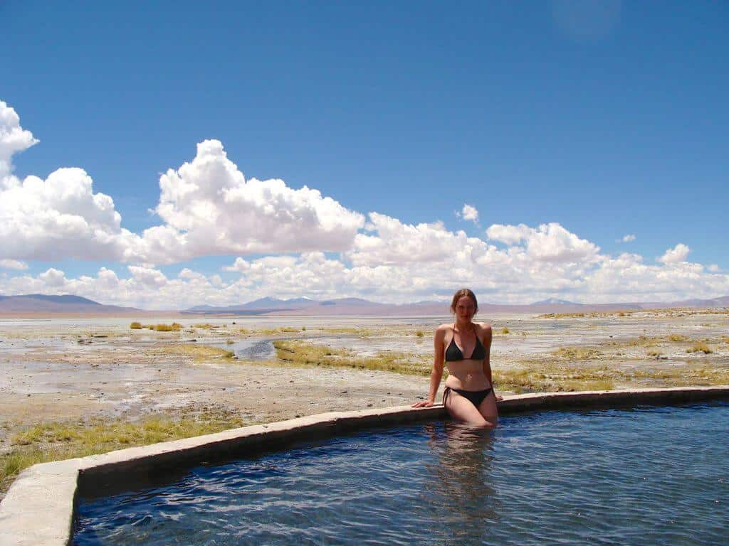 La note aquatique du voyage se poursuit avec l’arrêt fort apprécié à Aguas Calientes, où une petite piscine, construite aux abords d’une lagune, récupère l’eau de sources chaudes, avec une température de 38°C ! Ce bain « rafraîchissant » étant notre unique contact avec de l’eau chaude pendant notre séjour désertique, nous en profitons un peu !