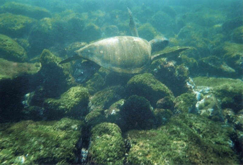 Après l’expédition au volcan, le tour enchaine avec une séance de masque-tuba à l’ilot Tintoretas. Celui-ci est connu, car des requins marteaux y viennent « presque » tous les jours (le presque : c’est quand nous y étions, évidemment !). Mais nous avons vu des raies, des poissons aussi colorés que dans les dessins animés, des poissons énormes (plus d’un mètre de long !), des oursins, des tortues marines, des manchots…