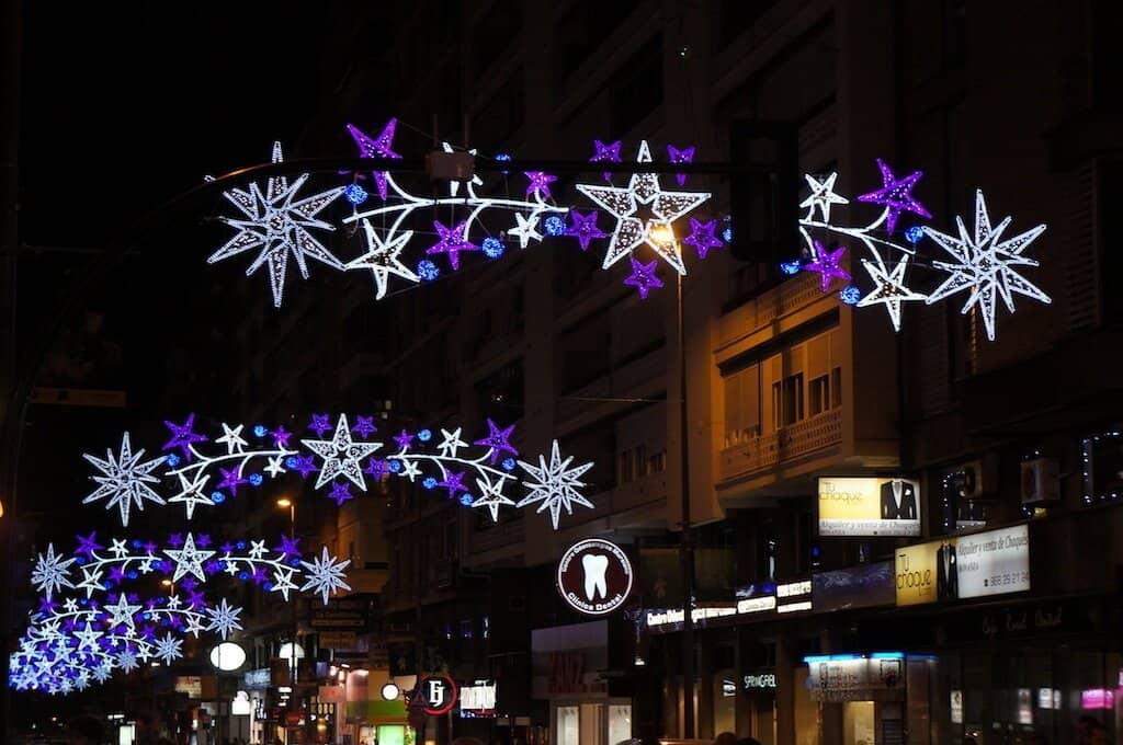 Les vitrines des boutiques se font la compétition à qui aura la crèche la plus jolie ou la plus originale (la crèche version bocal de poisson rouge, vous connaissiez ?), et les vendeurs de ticket de la ONCE (loterie nationale) sont parqués à tous les carrefours souhaitant un joyeux Noël aux passants. Les fenêtres dans les villages arborent un tissu rouge avec le petit Jésus, et des petits papas Noël grimpent le long des rambardes des terrasses … quand ce ne sont pas les Rois Mages !