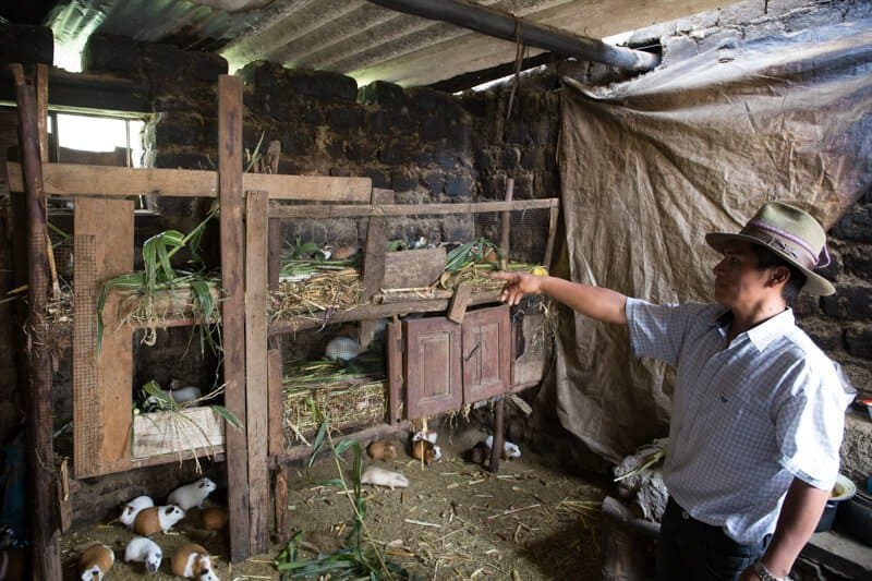 Cuy est le mot quechua utilisé pour désigner le cobaye (ou cochon d’Inde). Les Péruviens des Andes vivent souvent avec de nombreux cuys à leurs pieds, voire leur dédient une maison rien que pour eux. Une réserve de nourriture à portée de main …
