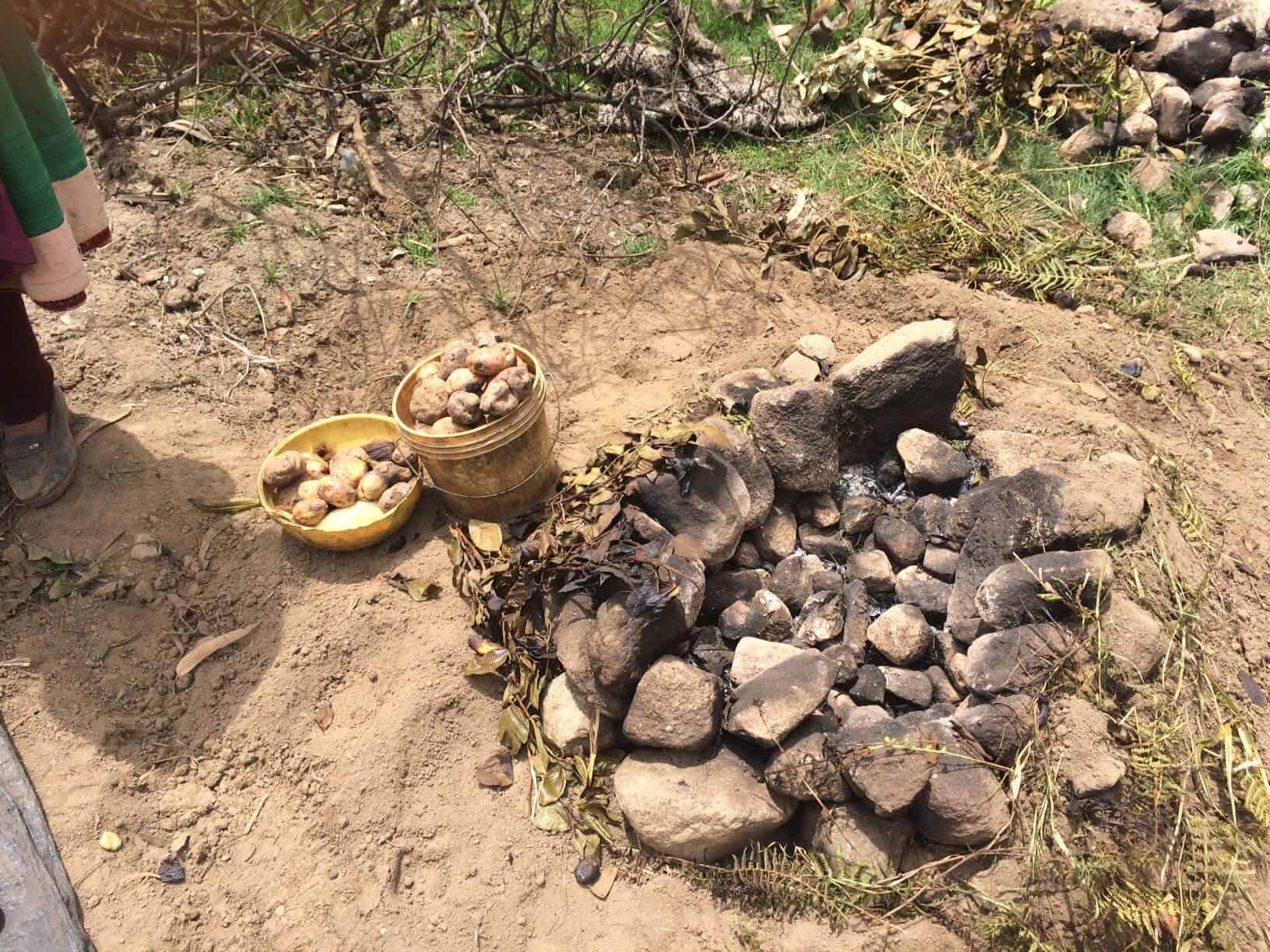 Quelques pierres tombent, Cristian dépose une première couche de pomme de terre. Les plus grandes. Quelques pierres en plus … Et ainsi de suite. Tel un tiramisu mi-pierre mi-pomme de terre, tout se met en place pour la cuisson. Mais ce n’est pas fini. L’on recouvre ensuite le tout de feuilles parsemées d’épis de maïs, puis l’on ajoute une bâche et l’on recouvre le tout de pierre, en prenant bien soin de boucher le moindre trou afin que la fumée ne puisse pas s’échapper.