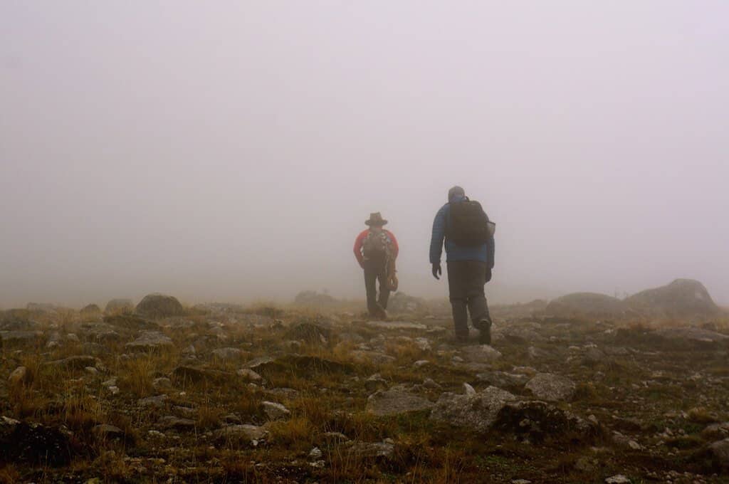 Oui, mais même doucement, avec l’altitude, ce n’est pas si évident que ça ! Le sol est soit boueux, soit glissant à cause des pierres humides. Une fois arrivés au sommet de la première montée, près de 45 minutes plus tard, le chemin nous semble bien plus facile. On respire et on profite, la tête toujours dans la brume.